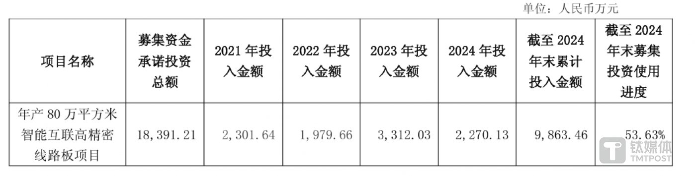 不过现实却略显骨感,公司募资金额大幅缩水,实际募集资金净额仅为1.84亿元,最终公司将前述资金全部用于年产80万平方米智能互联高精密线路板项目。