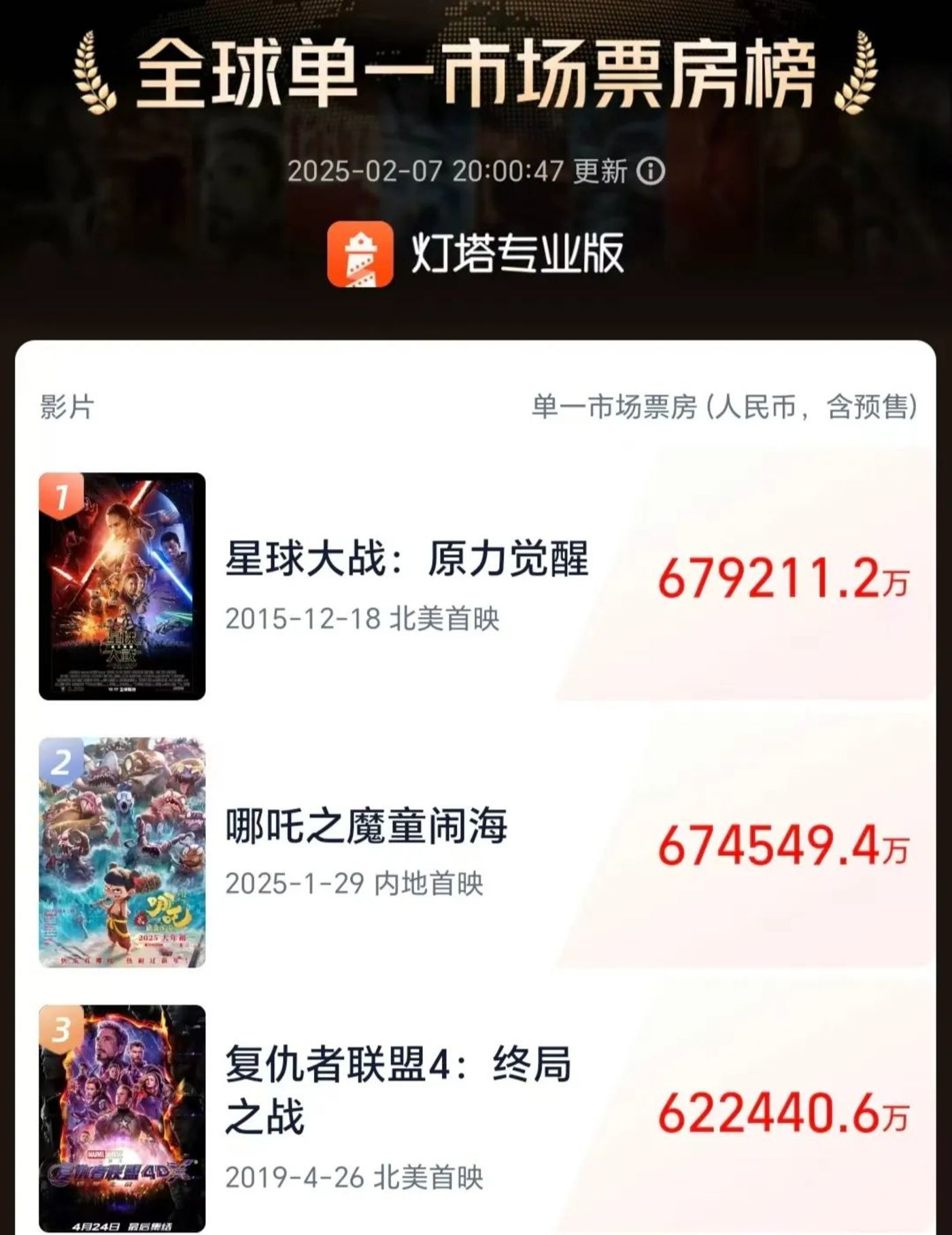截至发稿前,《哪吒2》的票房已高达67.4亿(含预售),观影人次则为1.31亿,距离《星球大战:原力觉醒》创下的全球单一市场票房榜纪录(67.9亿),也只有一步之遥。