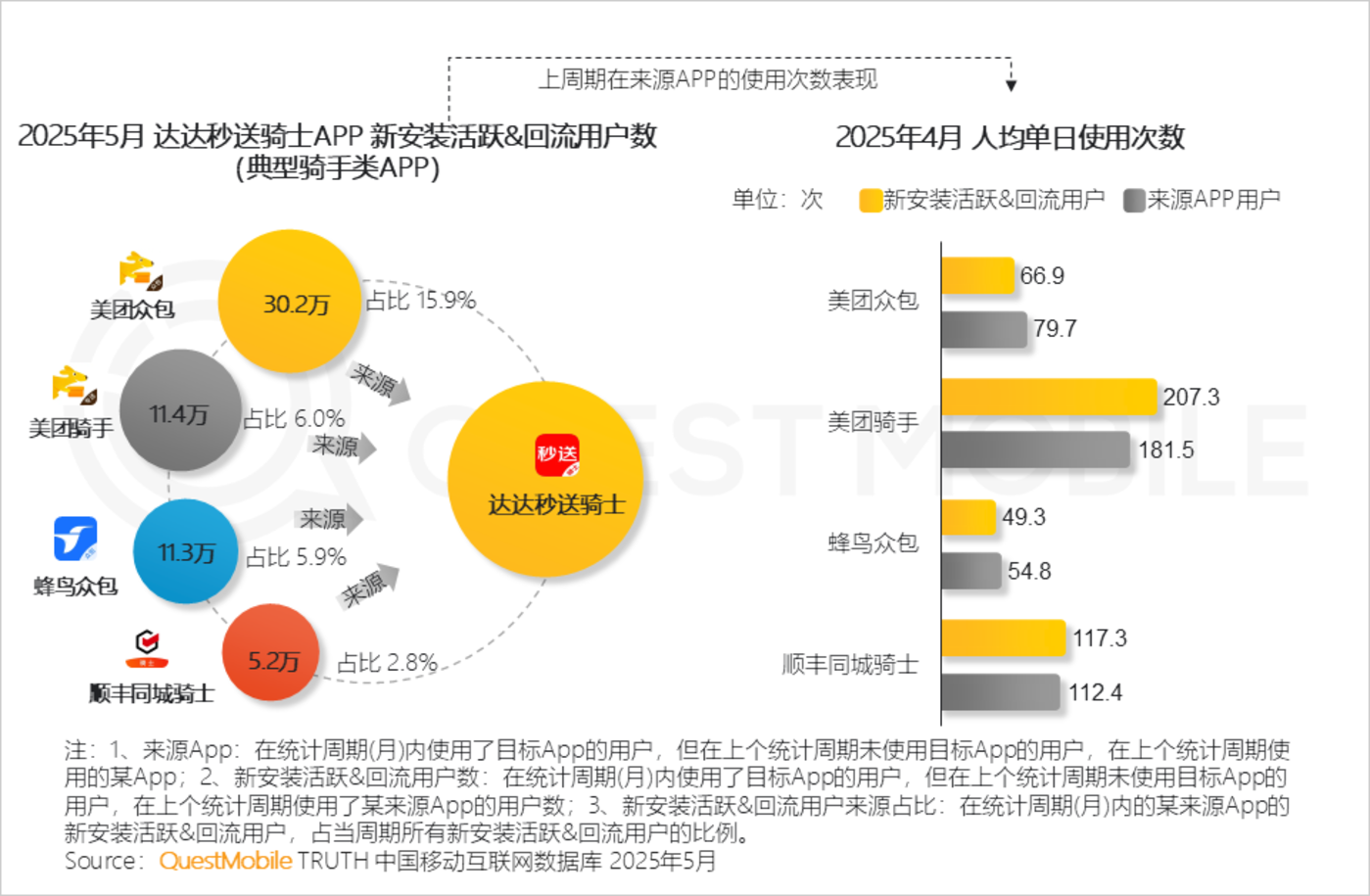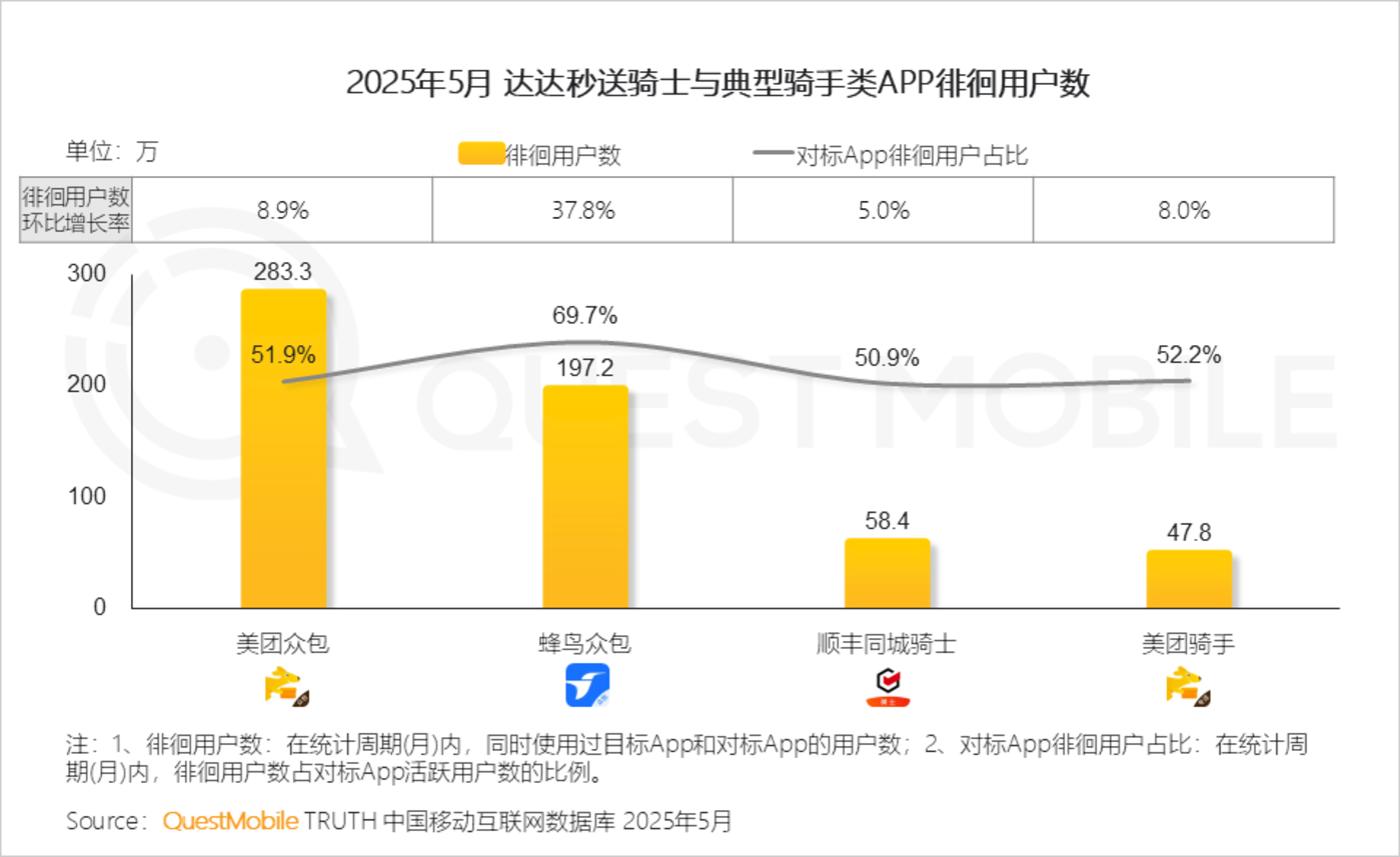 QuestMobile数据显示,截止2025年5月,京东旗下的达达秒送骑士APP月活跃用户规模超600万,同比提升368%,领跑骑手端应用市场,美团众包、蜂鸟众包APP月活跃用户规模分别达到546.3万和282.9万,增速也均实现两位数增长,分别为16.7%、30.7%。