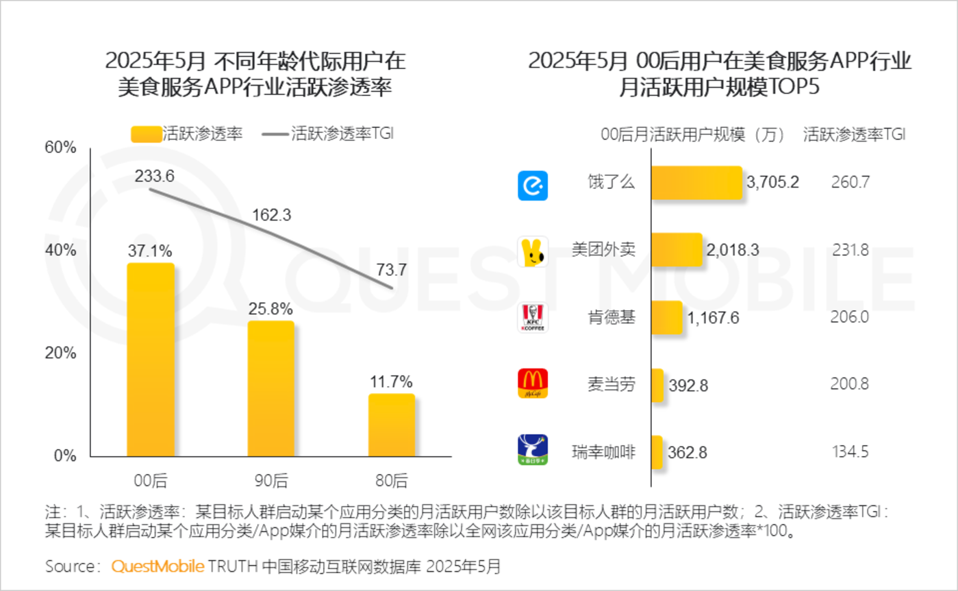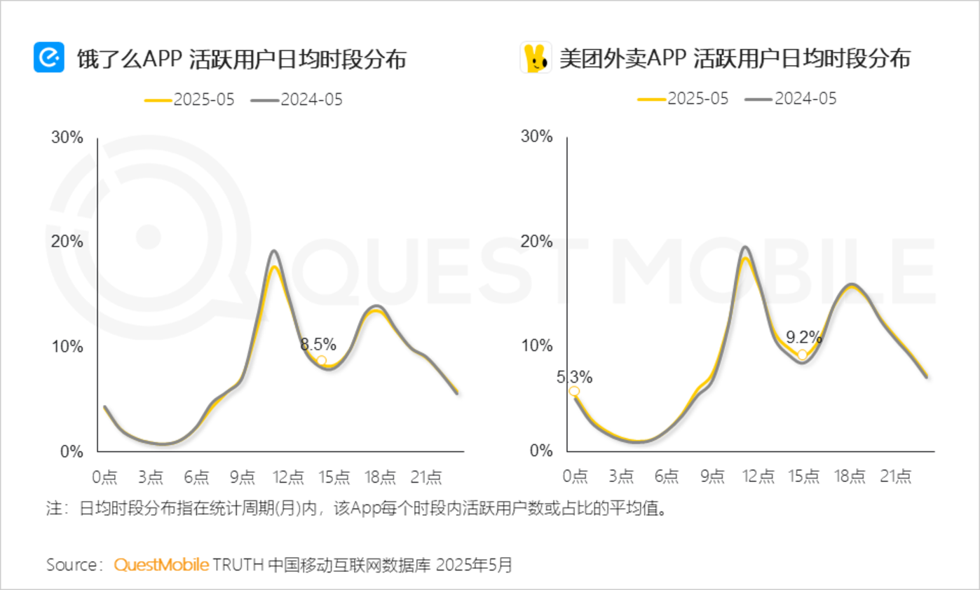 QuestMobile数据显示,截止2025年5月,饿了么APP14点-15点及15点-16点非正餐时段活跃用户比例均提升0.3%,美团外卖APP在相应时间段均提升0.7%。