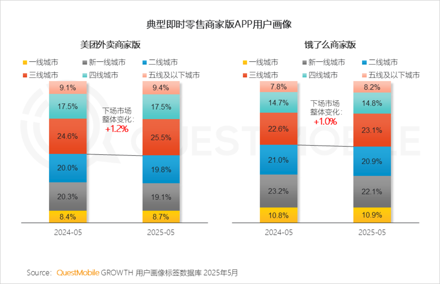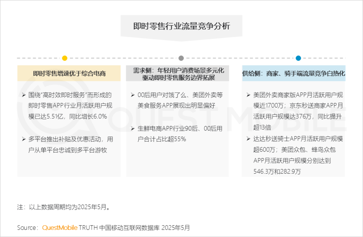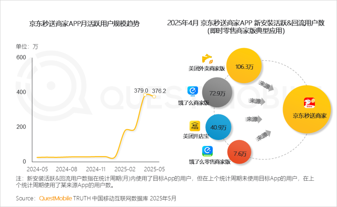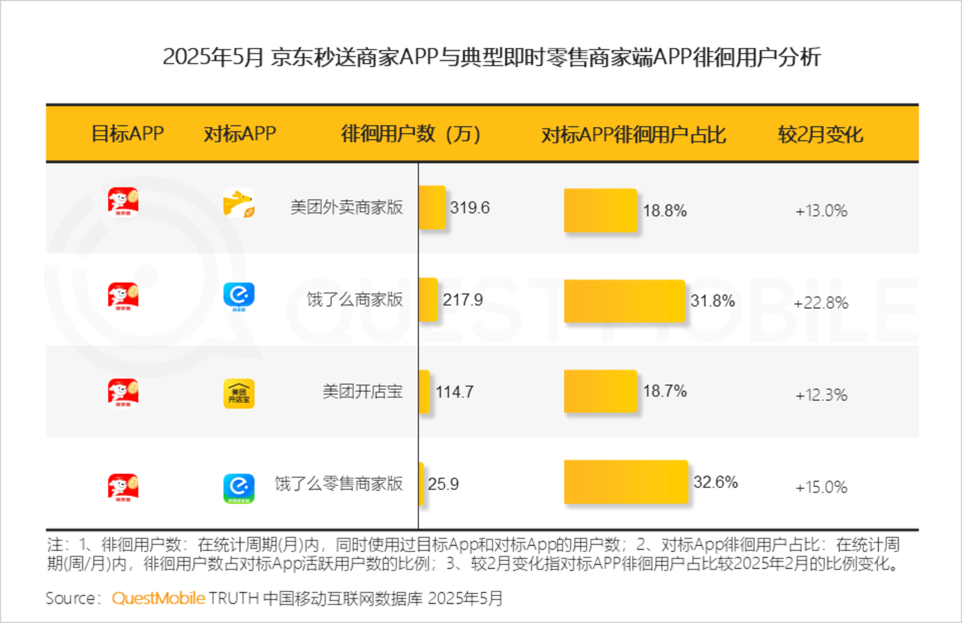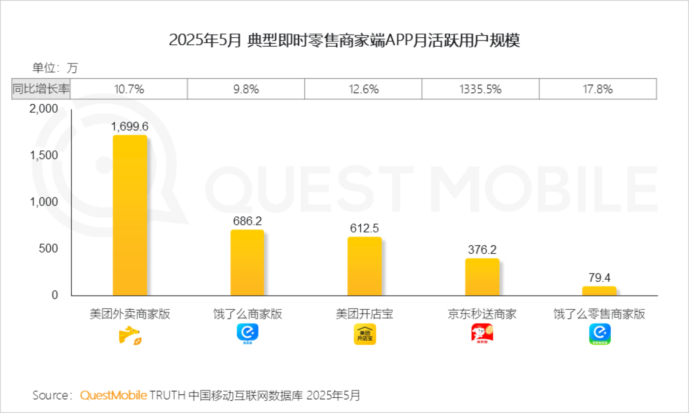 QuestMobile数据显示,截止2025年5月,美团外卖商家版APP月活跃用户规模近1700万,饿了么商家版、美团开店宝APP月活跃用户规模均超600万,京东秒送商家APP月活跃用户规模达376万,同比提升超13倍。