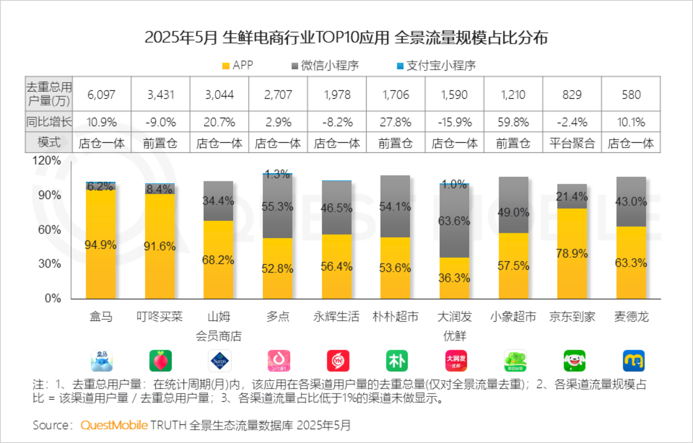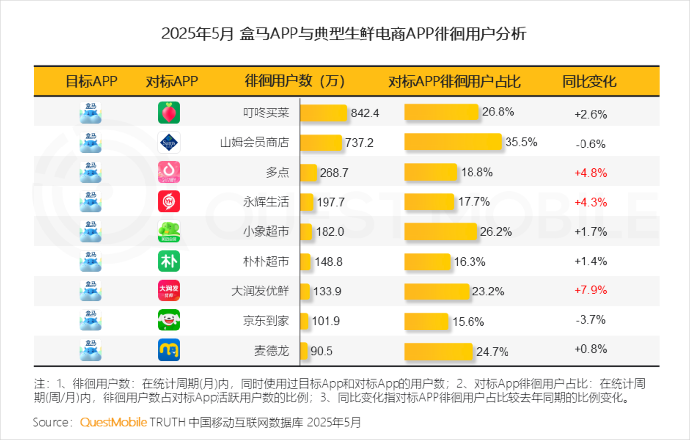 QuestMobile数据显示,2025年5月,盒马与叮咚买菜、山姆会员商店APP徘徊用户数较高,且大润发优鲜、多点、永辉生活等以线下为主的生鲜平台与盒马APP的徘徊用户比例进一步提升,反映出店仓一体模式下的激烈流量竞争。
