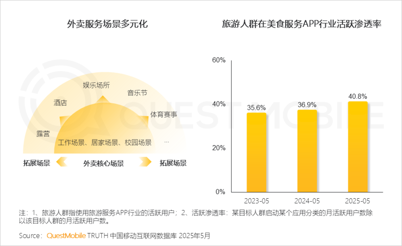 QuestMobile数据显示,旅游场景中用户对美食服务渗透持续提升,2025年5月,旅游人群在美食服务APP行业活跃渗透率已达40.8%,较去年同期提升3.9%。
