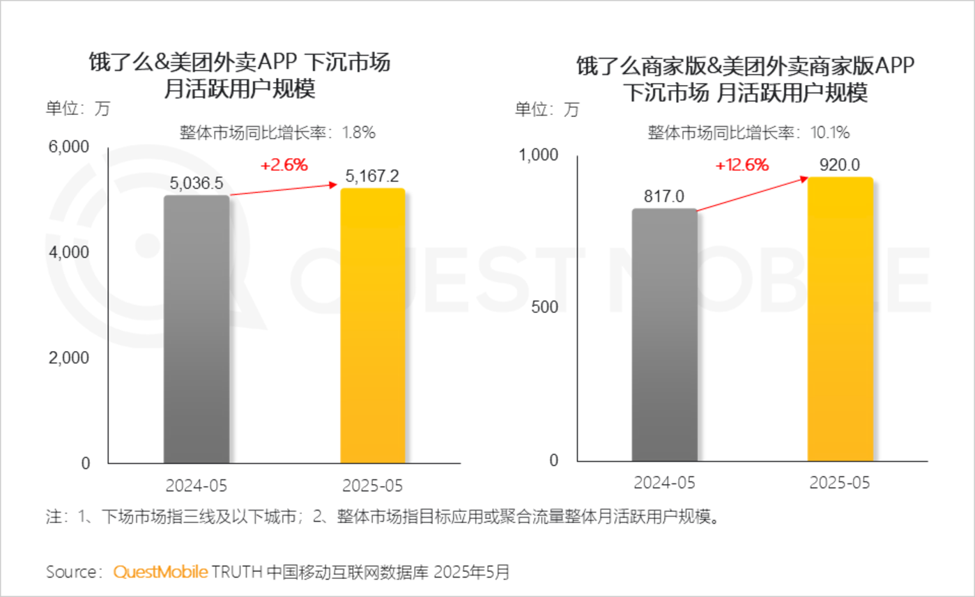 QuestMobile数据显示,下沉市场中,饿了么与美团外卖APP总体去重用户规模已达5167万,同比增速2.6%,优于整体市场;饿了么商家版与美团外卖商家版下沉市场总体去重用户规模达920万,同比增速12.6%,亦优于整体市场增长表现。