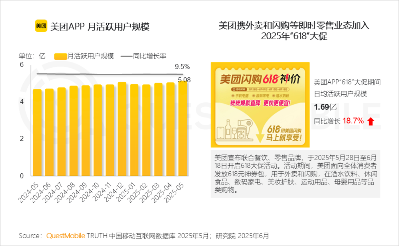 QuestMobile数据显示,美团在2025年618大促期间,日均活跃用户规模达1.69亿,同比增长18.7%。