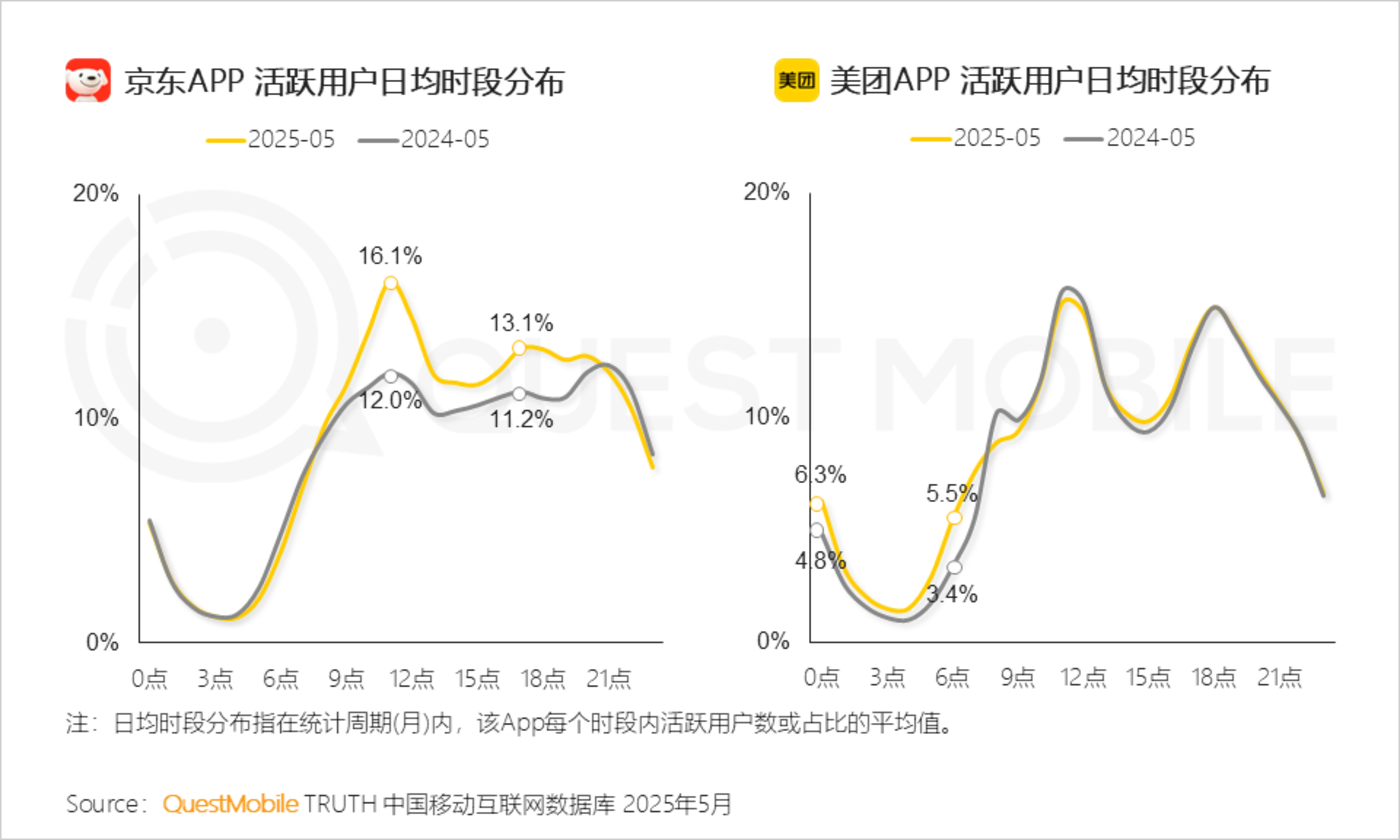 QuestMobile数据显示,截止2025年5月,京东APP11点-12点午间点餐高峰时段、18点-19点的晚间点餐高峰时段活跃用户比例提升显著,分别提升4.1%和1.9%;美团APP在夜间零点时段及早间6点-7点时段活跃比例提升明显,分别提升1.5%和2.1%。