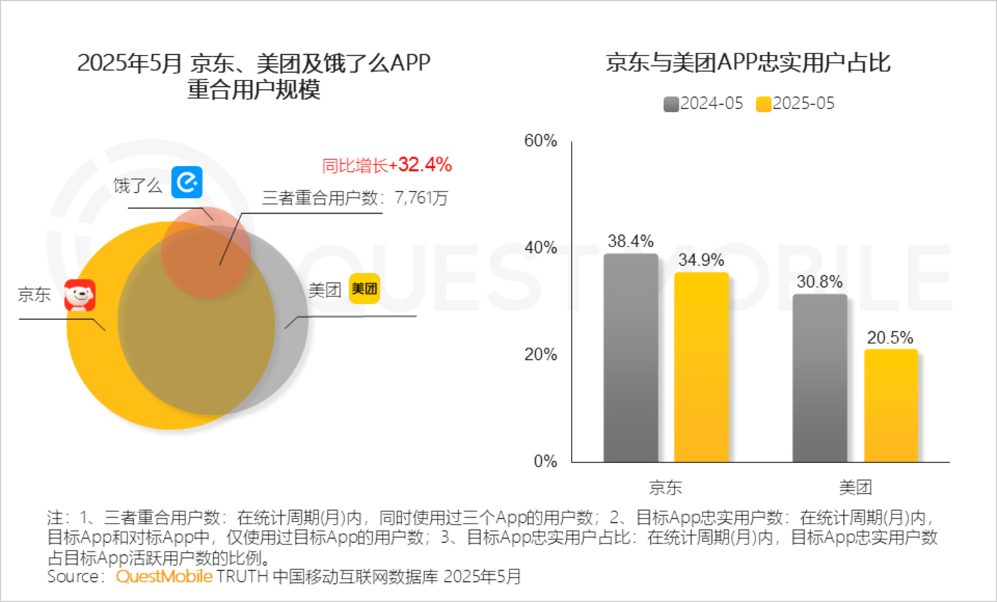 QuestMobile数据显示,2025年5月,京东与美团、饿了么APP三者重合用户规模已达7761万,较去年同期增长32.4%;京东与美团APP各自忠实用户比例均出现下滑,展现出用户在多平台间对比使用的倾向加强。