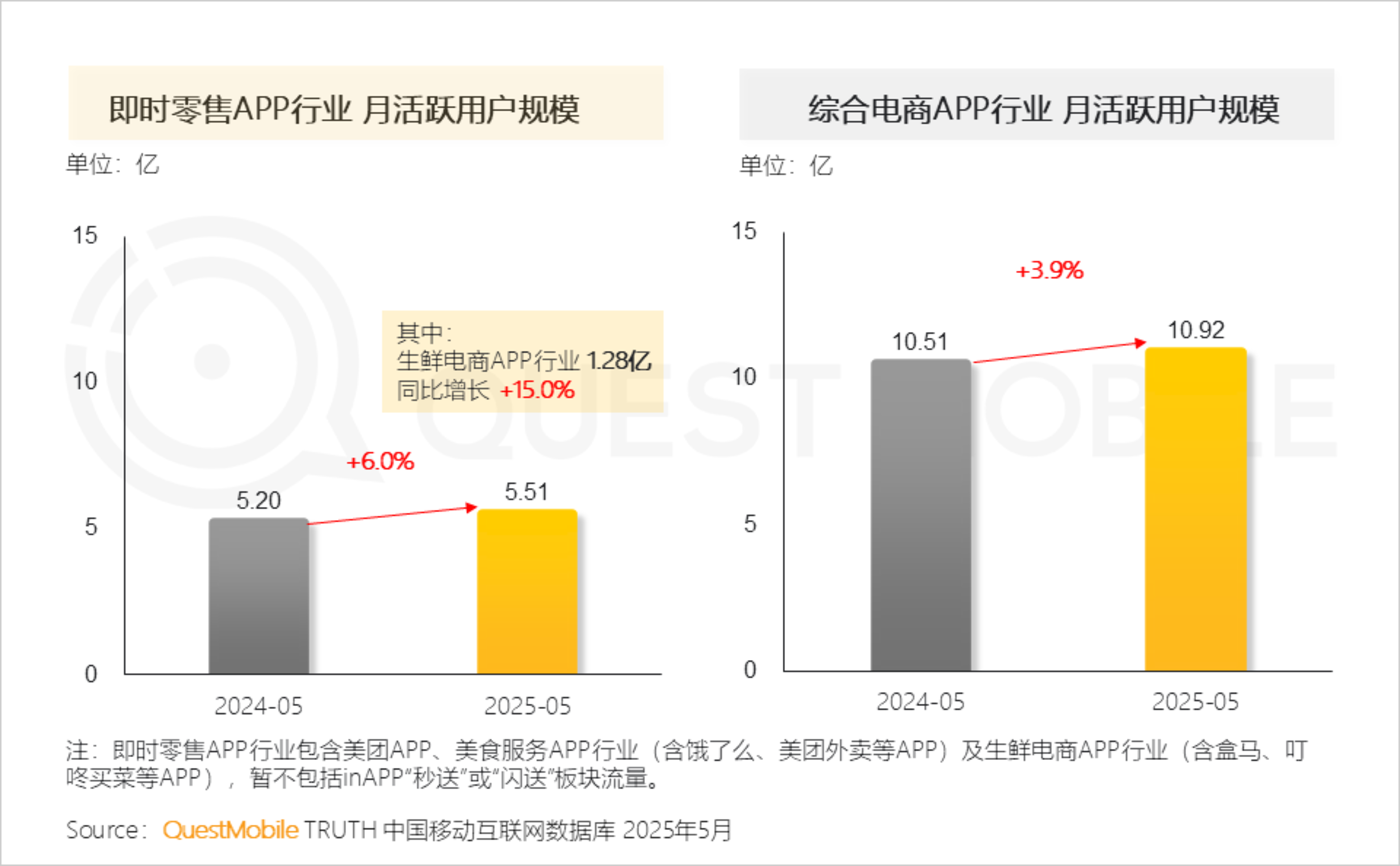 QuestMobile数据显示,截止到2025年5月份,即时零售APP行业月活跃用户规模达到5.51亿,同比增长了6%,其中,生鲜电商APP行业月活用户规模达到1.28亿,同比增长了15%。
