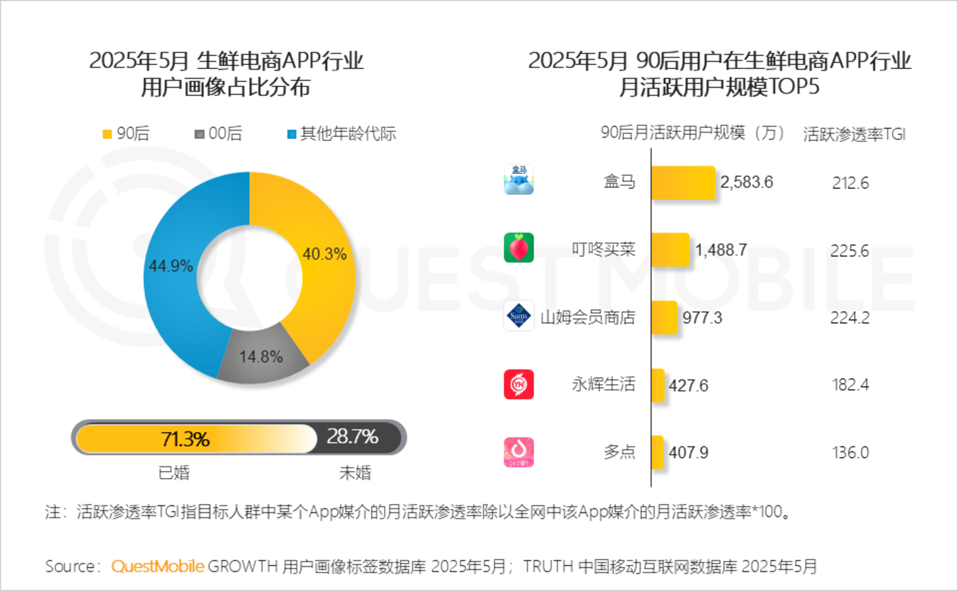 QuestMobile数据显示,生鲜电商APP行业90后、00后用户合计占比超55%,且多为已婚家庭用户,家庭日常生活生鲜采购需求旺盛,对叮咚买菜、山姆会员商店、盒马等APP偏好突出。