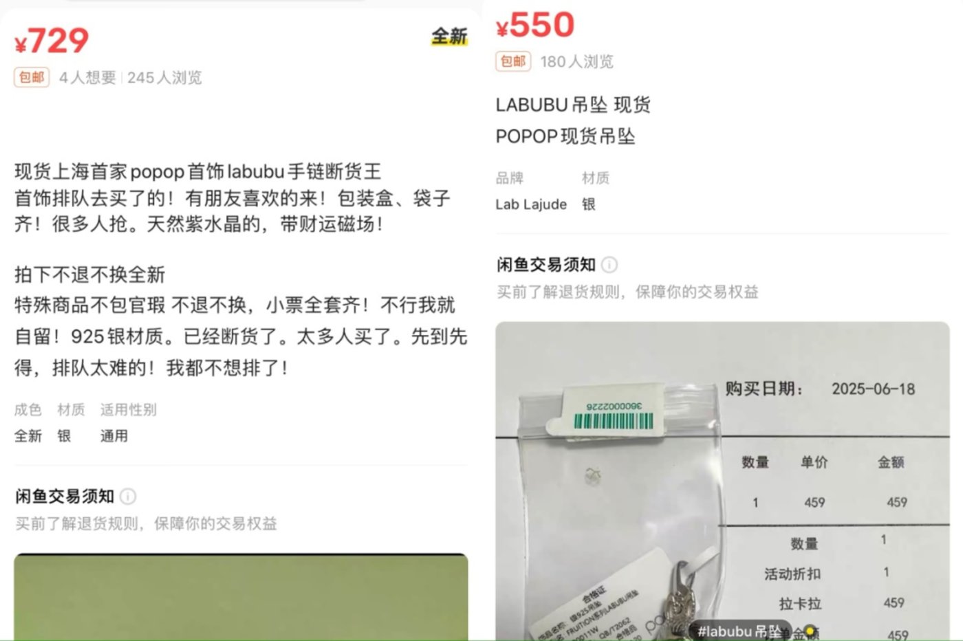 在某二手交易平台,除了有代购,很多人开始转手popop饰品,其中原价为459元的LABUBU吊坠转售价为550元,原价为699元的LABUBU紫水晶手链转售价为729元-750元,整体溢价不多,且“想要”人数较少。