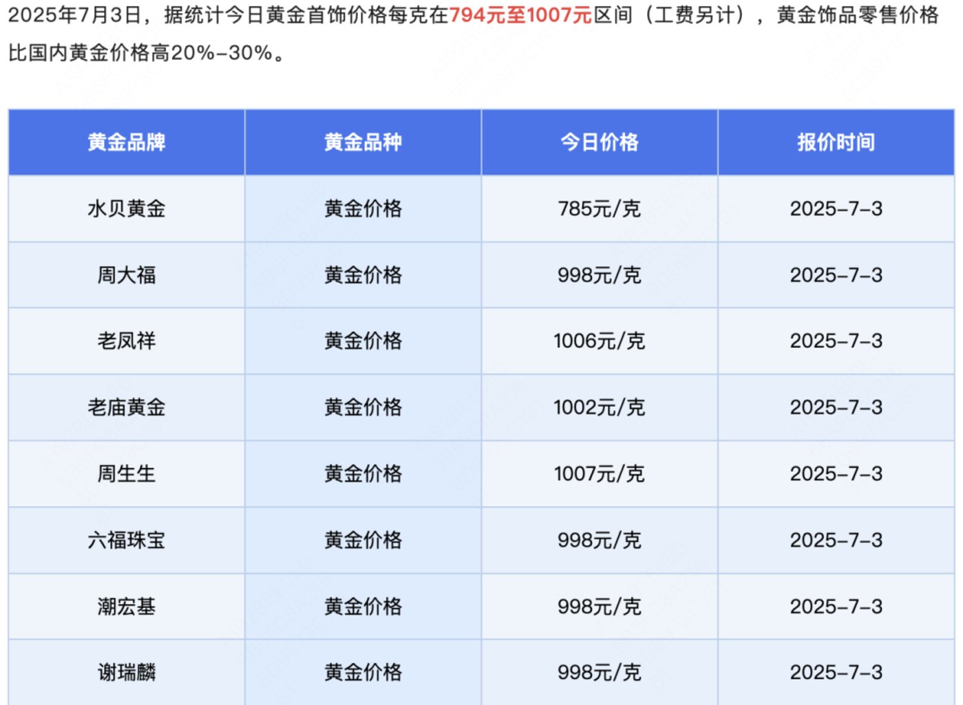 饰品金的挂牌价早就脱离了投资金的市场价。以2025年6月的数据为例,深圳水贝投资金条的回购价在760元/克左右,但主流品牌金饰挂牌价已经逼近1000元/克,再加上每克100-150元不等的工费,一件传统龙凤手镯下来,动辄50克起步,价格轻松过5万元。