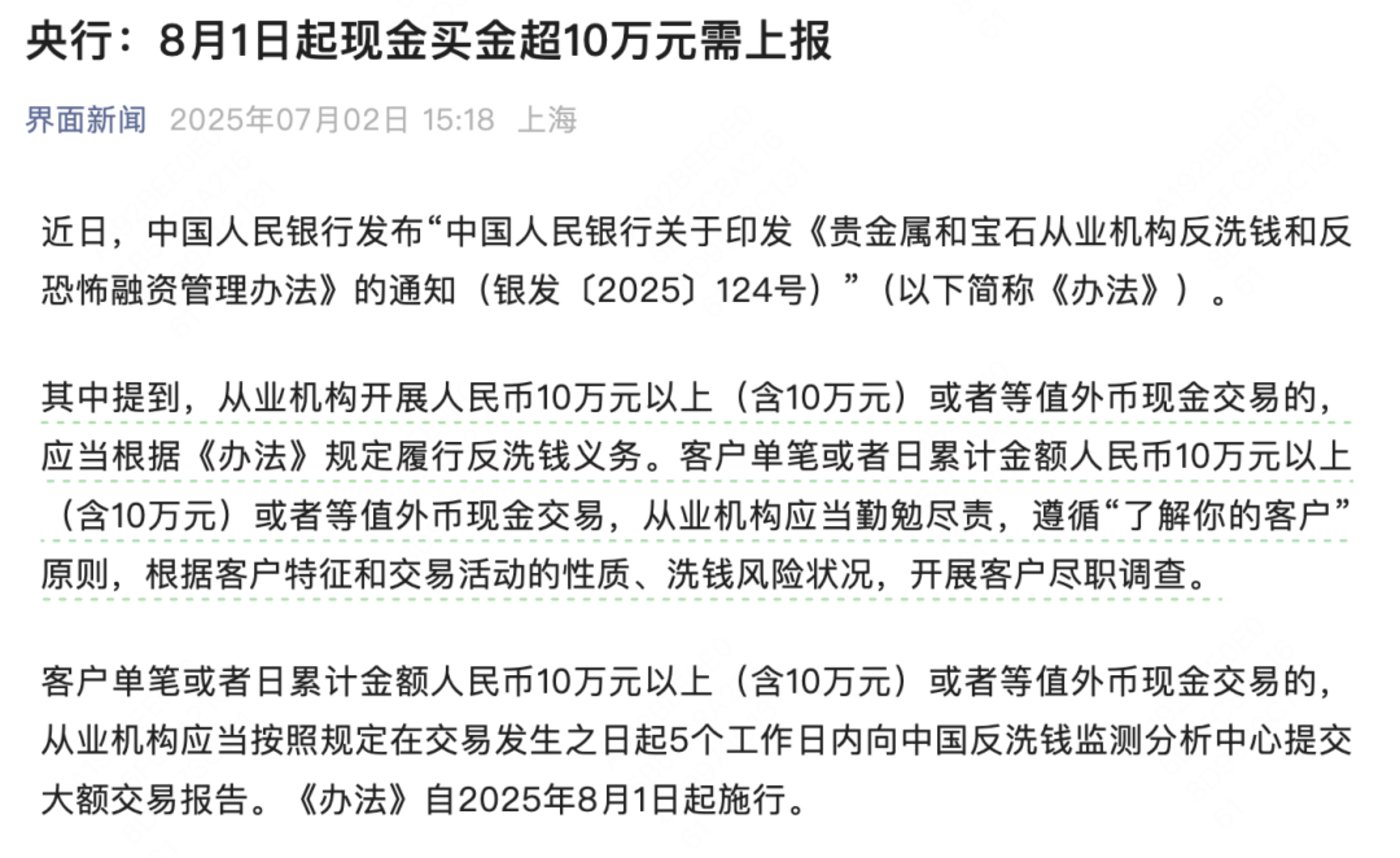 7月2号,央行低调发布了一份事关黄金买卖的新规:《贵金属和宝石从业机构反洗钱和反恐怖融资管理办法》。最醒目的变化在于:从今年8月1日开始,个人现金购买黄金超过10万元的,就得上报。
