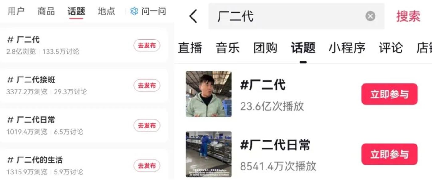 如今在社交平台上,“厂二代”已成为一个热门标签。在小红书上,“厂二代”话题浏览达到2.8亿次,“厂二代接班”“厂二代日常”“厂二代的生活”等话题浏览量也都超过千万。抖音上,厂二代标签视频播放超过28亿次。