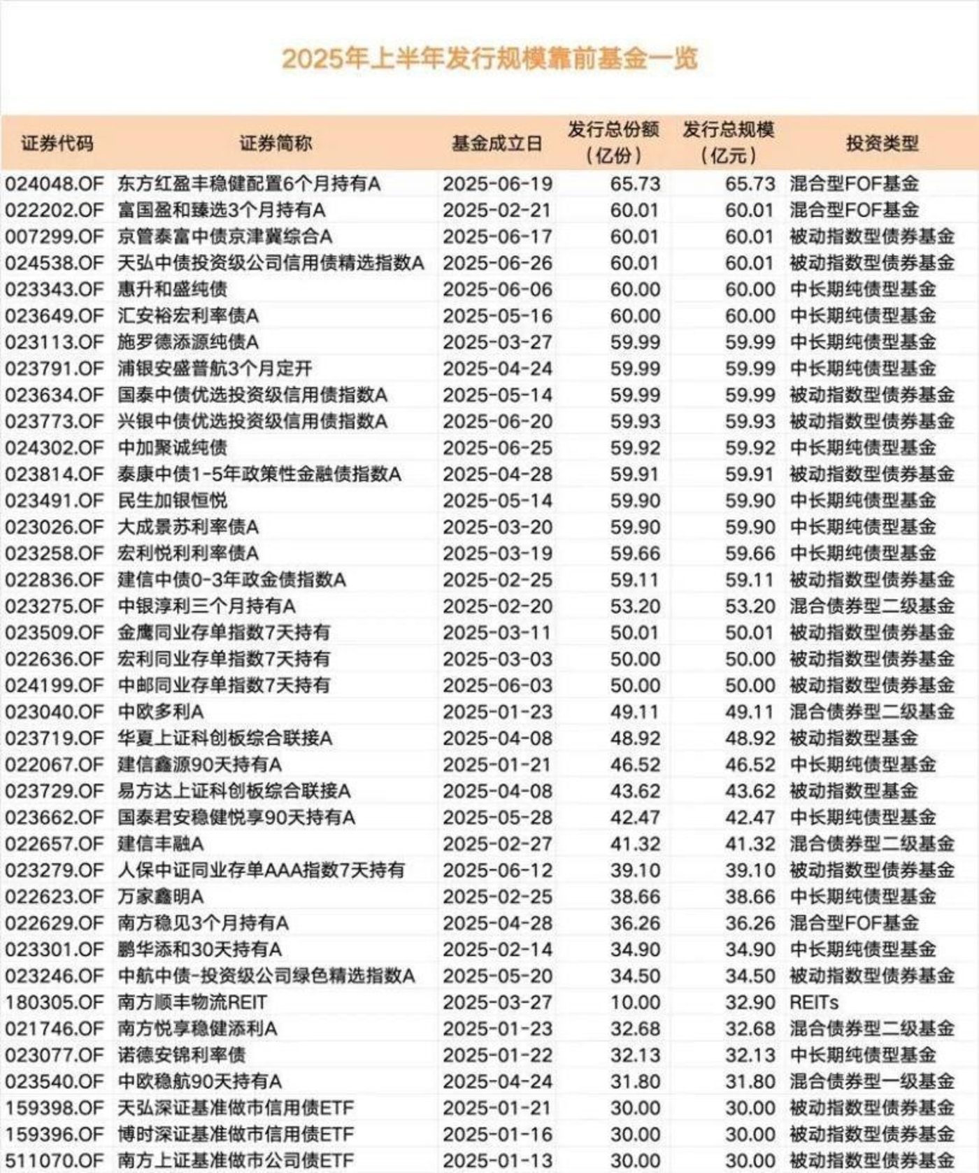 FOF基金的发行表现同样引人注目。虽然31只的总量仅占新发基金的4.56%,但其同比增幅达82.35%,环比更是飙涨93.75%,迎来发行小高峰。上半年发行量最大的基金,东方红盈丰稳健配置6个月持有A,其便以65.73亿元的发行规模拔得上半年发行量“头牌”。