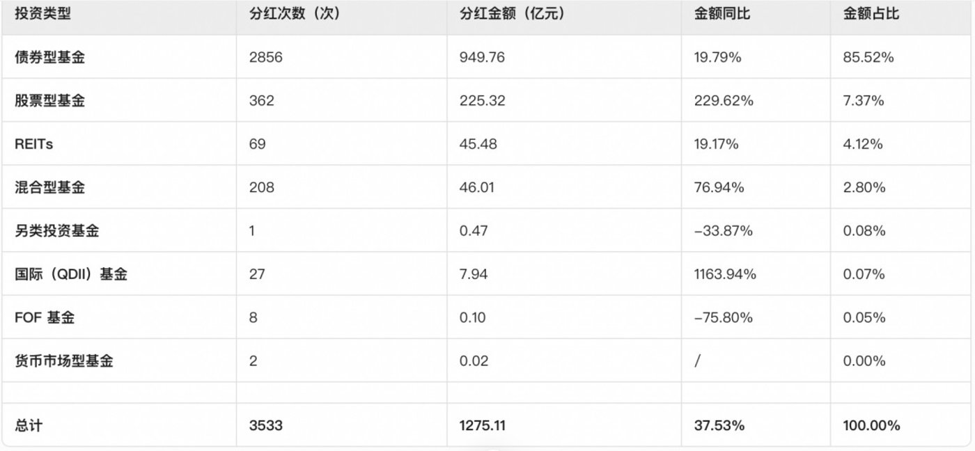 根据公募排排网数据显示,截至2025年6月30日,今年上半年公募基金累计分红3533次,分红总额达1275.11亿元,同比增长37.53%。其中,债券型基金以超85%的分红总额占比稳居主力,QDII(合格境内机构投资者)基金分红金额同比激增1163.94%,权益类基金分红金额亦实现翻倍增长。