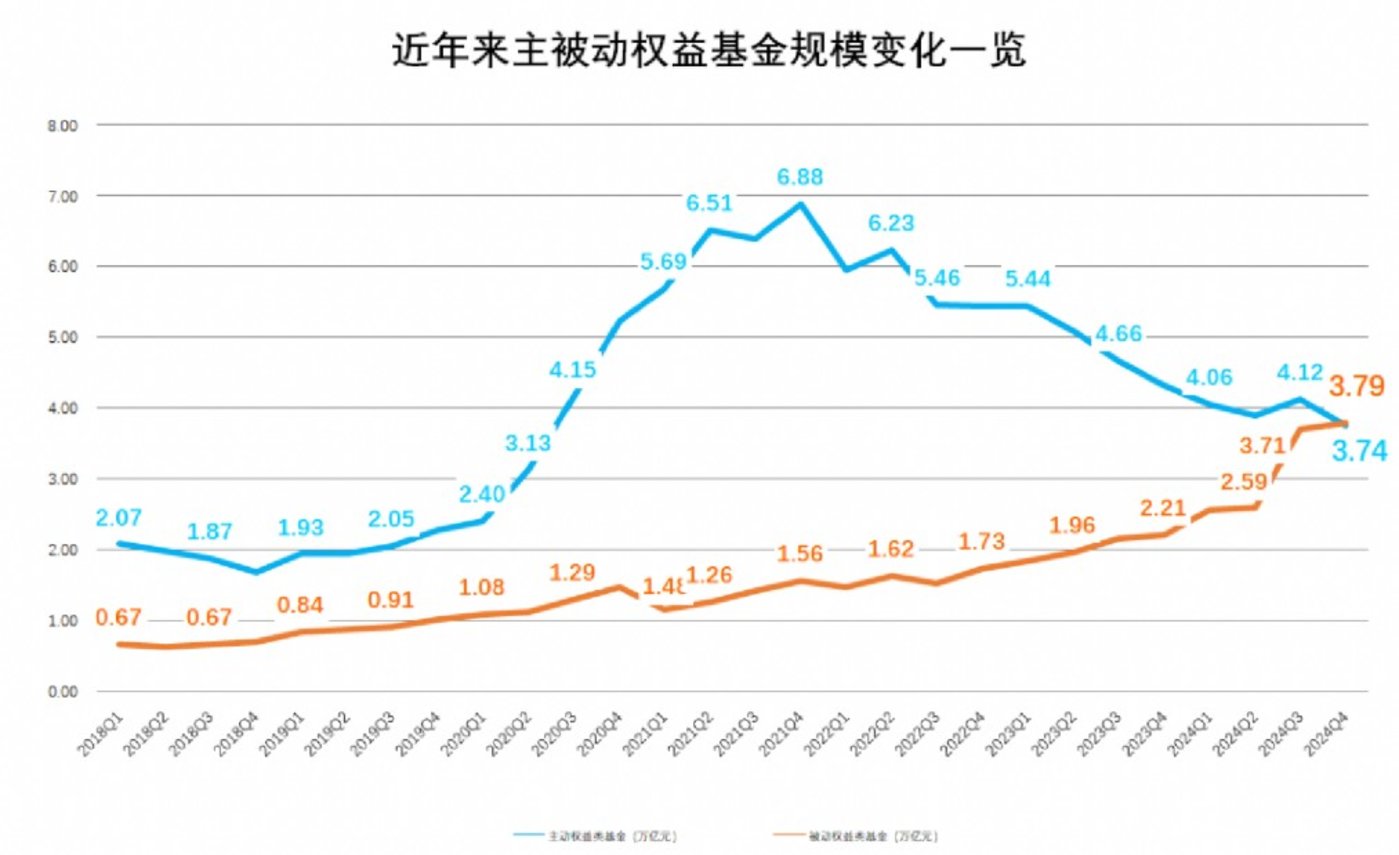 根据基金业数据机构济安金信基金评价中心数据,2024年末,被动型基金(含 QDII 被动权益基金)管理规模达 3.79 万亿元,首次超越同期主动权益类基金(含 QDII 主动权益基金)3.74 万亿元的规模 。