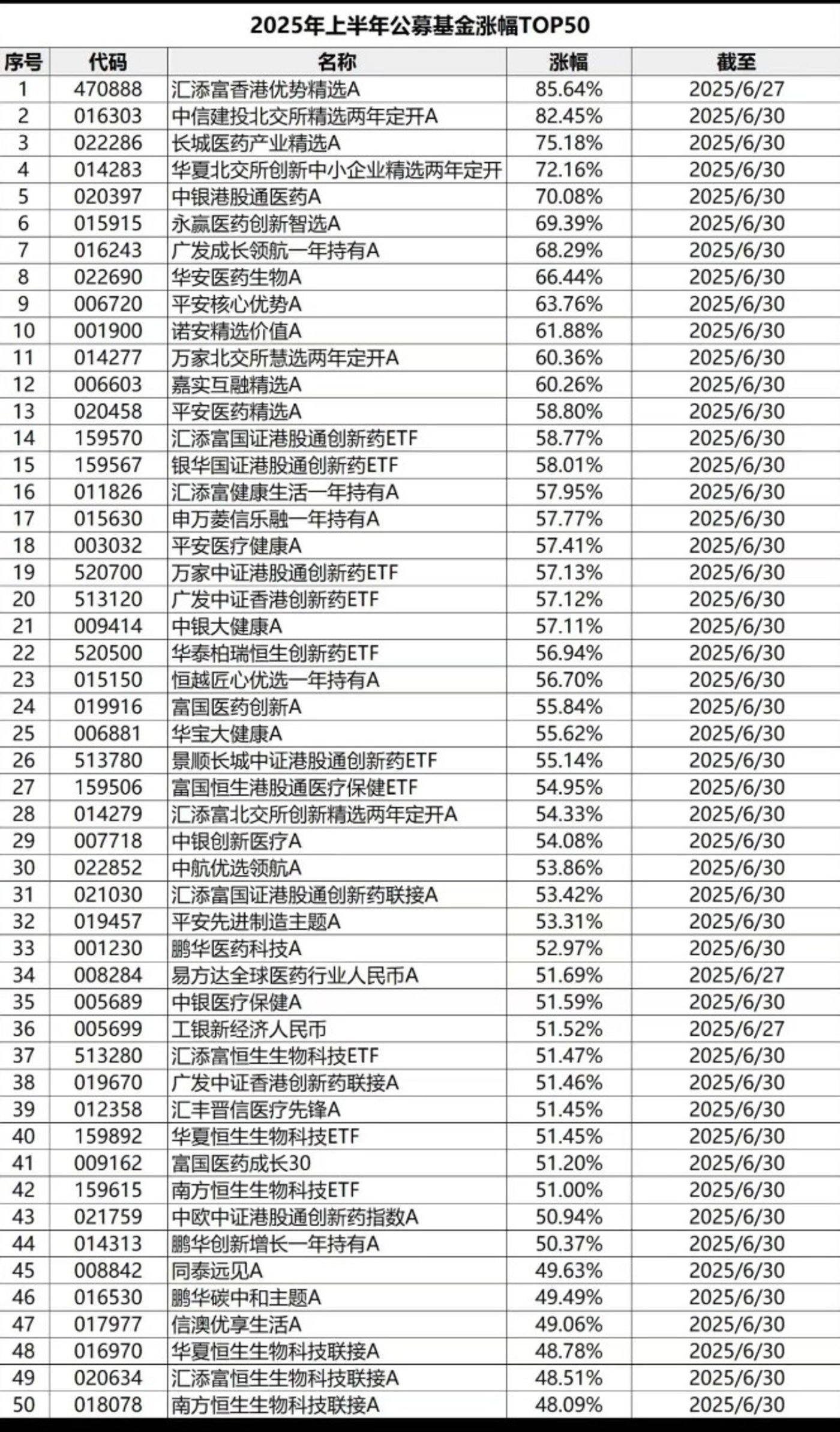 根据Wind数据显示,2025年上半年,全市场87%的公募基金实现正收益。表现最好的是汇添富香港优势精选A,净值增长86.48%。需要注意的是,创新药主题基金和北交所主题基金基本占据了上半年公募基金涨幅榜TOP50。TOP10中,7只为重仓创新药的基金,2只为北交所主题基金,1只为均衡配置型基金。