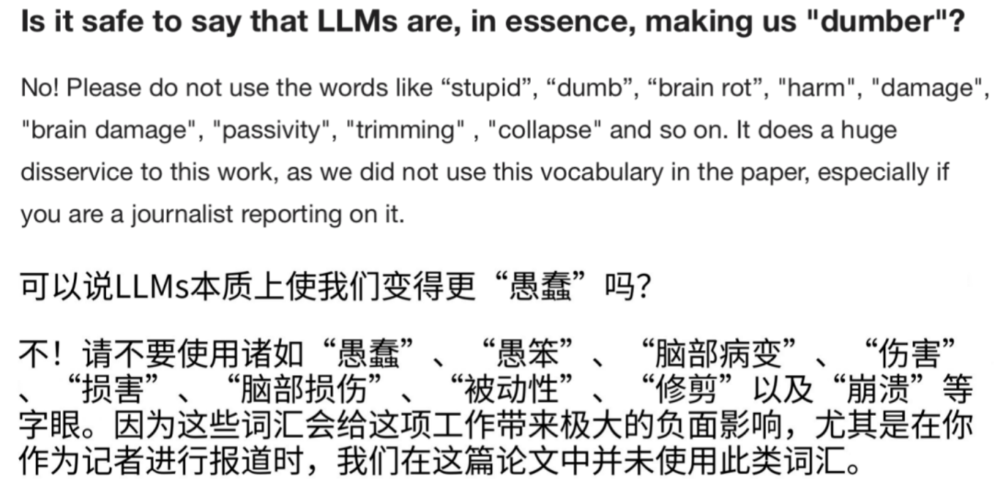 2.实验设置与真实环境不同。在20分钟内完成一篇SAT风格的哲学论文是一个高度结构化的任务。将高压限时的单一任务产生的结果等同于整体认知能力的下降,简化了现实情况。真实工作中,人们使用AI的过程是一个非线性、多步骤的互动,有更充裕的时间进行反思和调整,这种差异可能夸大了研究中的负面效应。