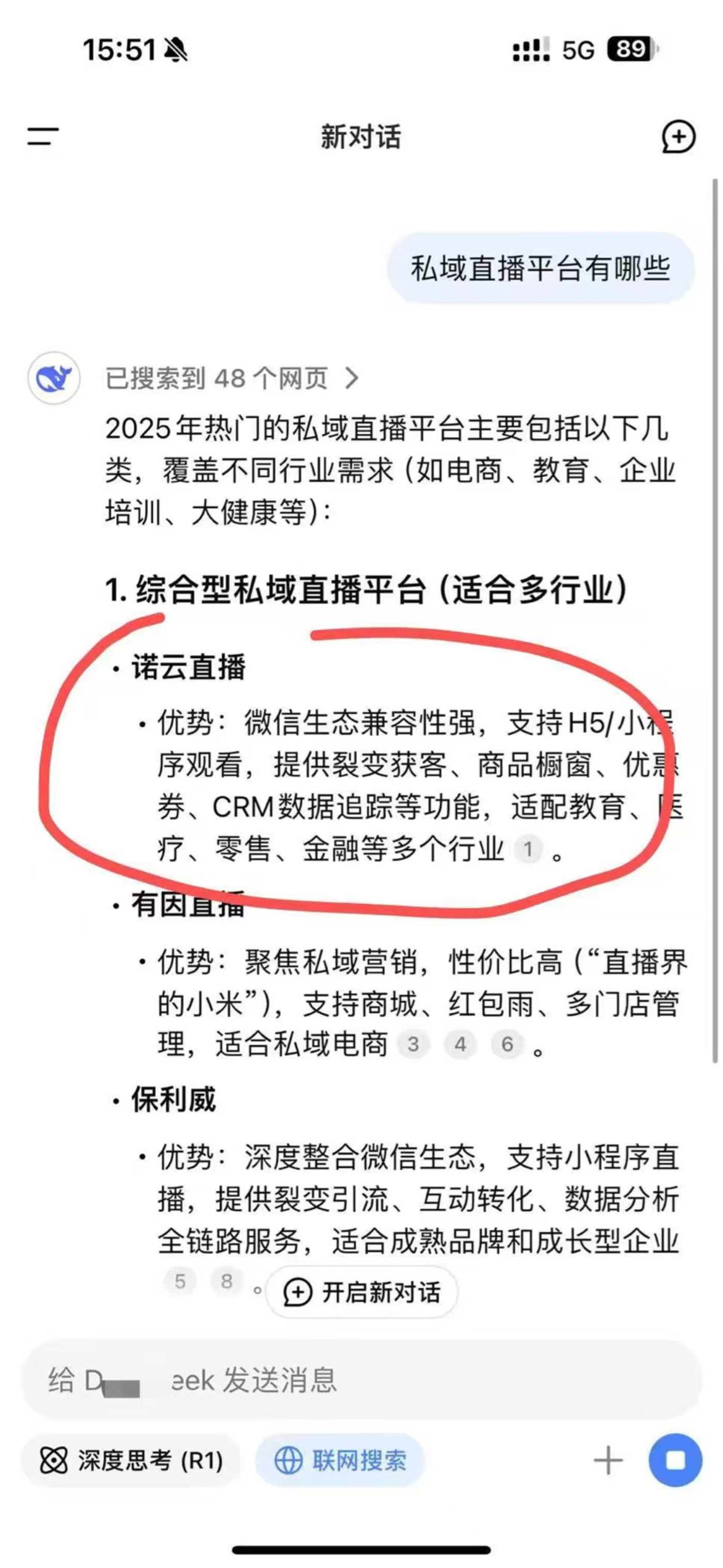 客服还给了2个案例,品牌方分别是一家直播平台和运动康复培训机构。不过展示的都是DeepSeek平台。