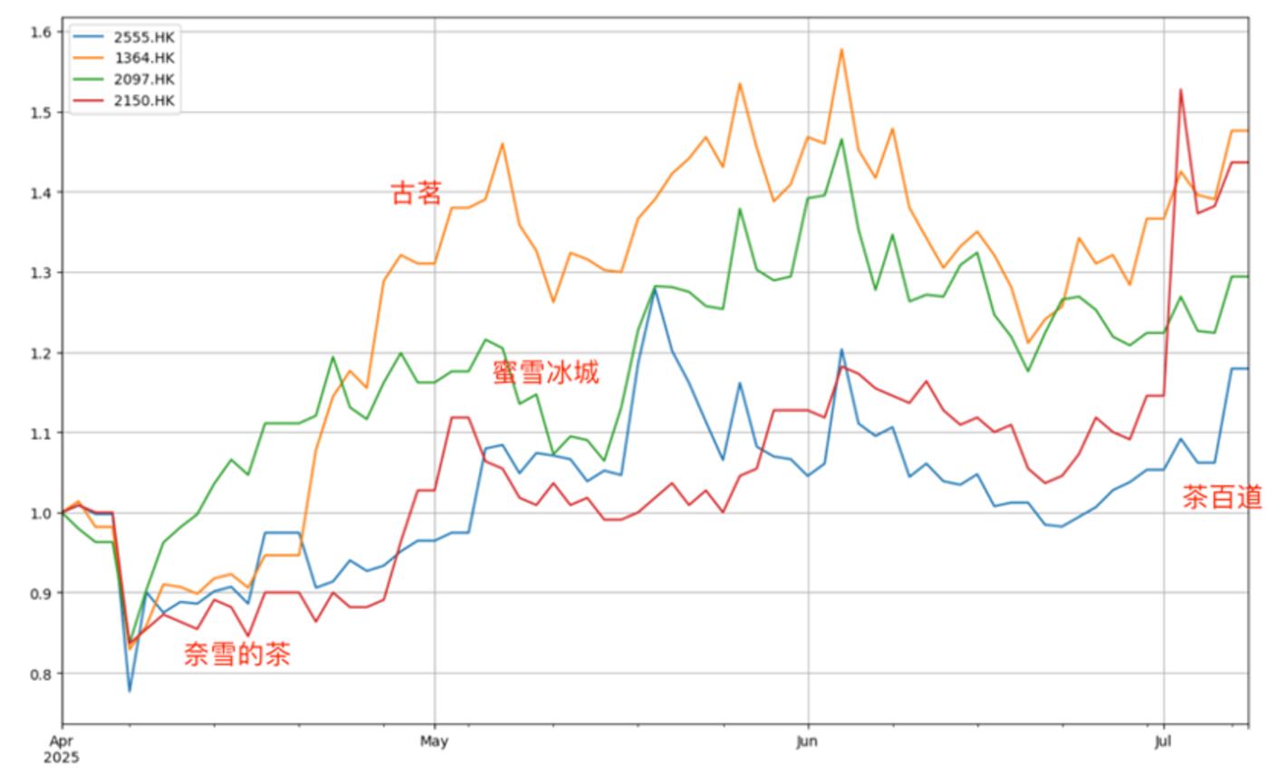 2025年4月中旬,某平台高调发起外卖大战后,茶饮新贵蜜雪冰城和古茗旋即获得利好,股价获得2-5成左右的涨幅,只是对比之下规模和实力相对较弱的茶百道和奈雪的茶没获得股票溢价,而在近期以淘宝闪购主导的500亿消费券补贴政策下,全行业股价却呈明显的上涨势头。