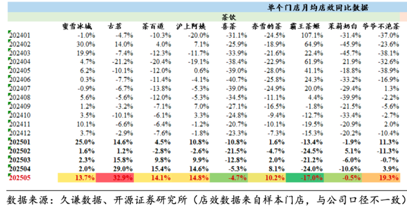 上述推论在开源证券的报告中也能得到验证,蜜雪冰城和古茗单门店坪效在2025年4月得到了较快的增长,而茶百道,奈雪的茶,喜茶等品牌表现则较为平淡(两年当月同比增速平均值均为负值)。