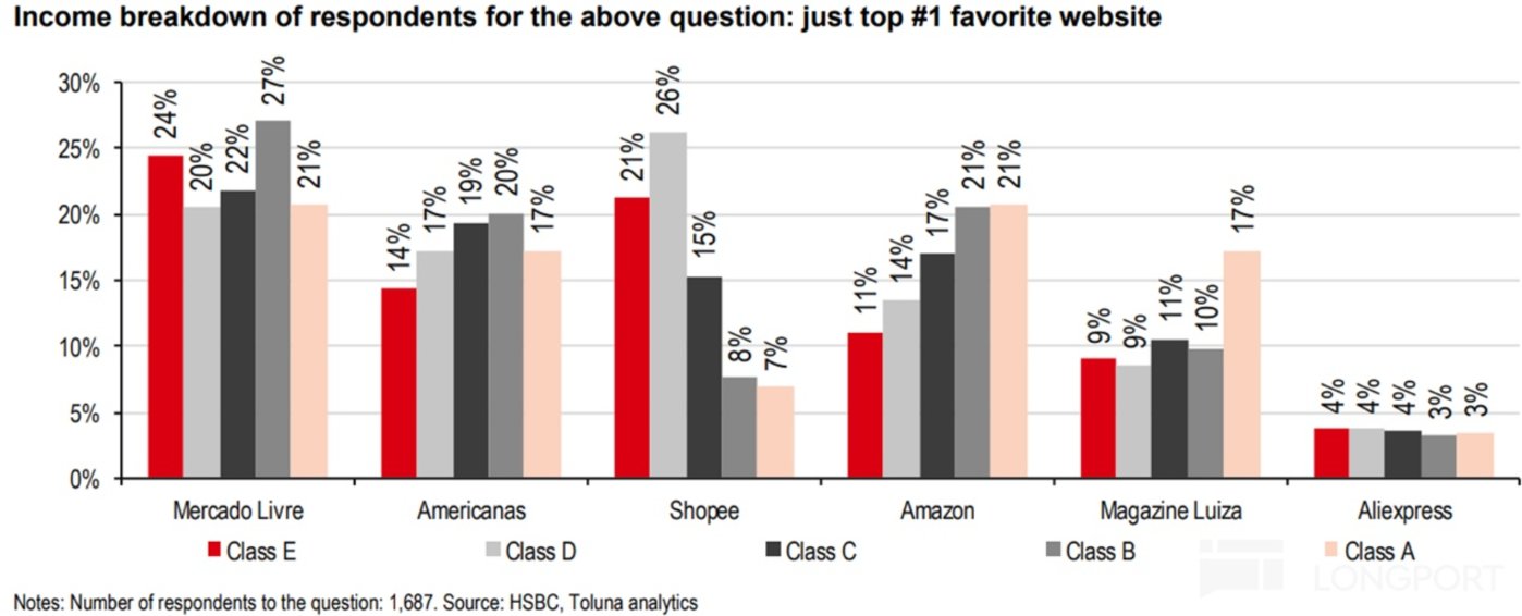 从另一个侧面,根据HSBC在2022年在巴西争对当地不同收入水平消费者首选电商平台的调研, Meli在巴西各收入等级的人群中基本都是首选平台(首选率在20%~27%)。而Shopee则明显呈现出在低收入水平人群内的首选率相当高,但随着人群收入水平提高首选率快速下降的情况。(需注意这是2022年时的调研,目前Shopee在高收入人群中的认可率应当是有改善的)