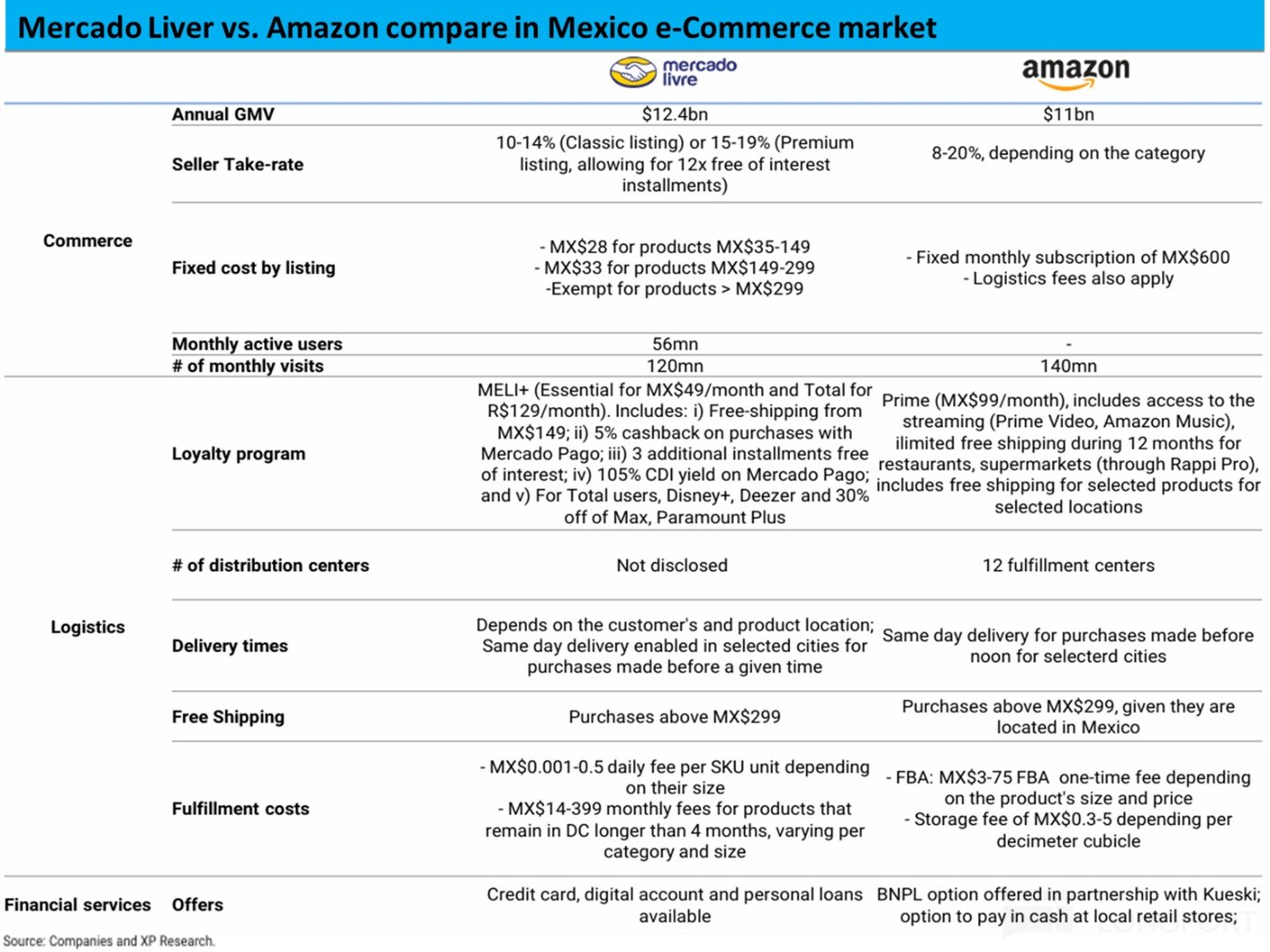 下表也提供了Meli和Amazon在墨西哥市场的各种数据的比对,基本上两家差距不大。海豚也不同费笔墨展开了。