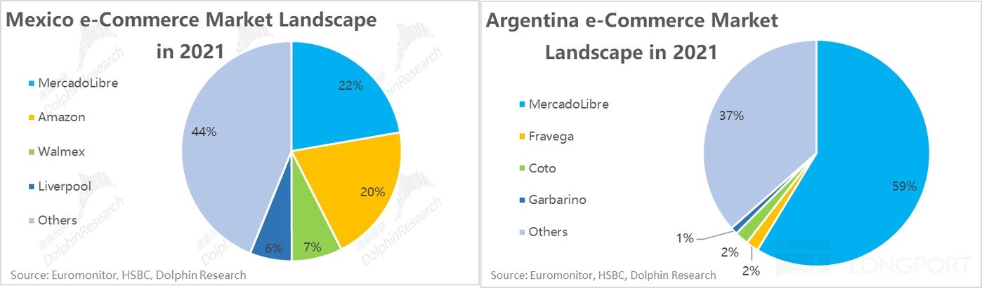 也能看到,拉美电商行业的市占集中度明显偏低,市场仍相当分散。 以中美两国为例,同为地区市场内的最大玩家,Amazon和阿里巴巴在各自市场内的市占率都在40%左右,远高于Meli。