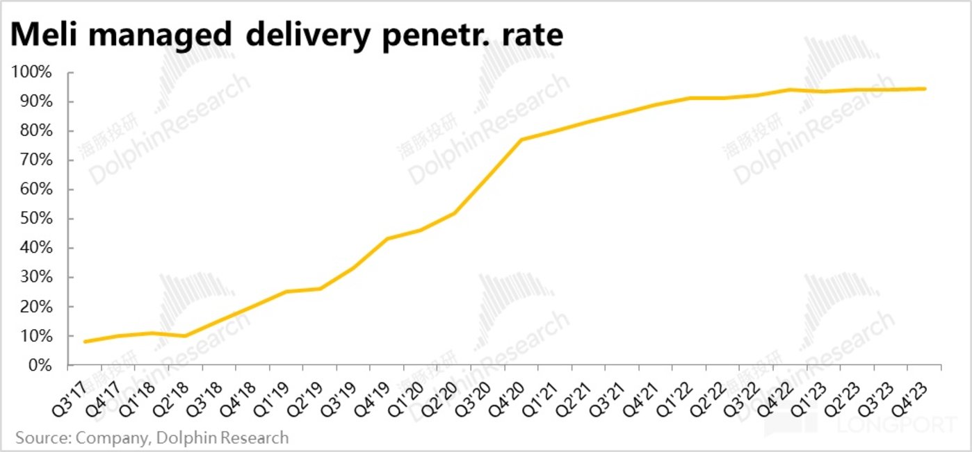 根据公司官方的披露,Meli自管物流(Managed Logistics,包括Cross docking和fulfillment两种形式)的订单量占比从17年的仅10%左右,到2023年底已快速爬升至94%以上,且自管物流比例快速攀升的阶段约在18年中(即疫情前2年)就已开始。提前加快自管配送建设的选择,让公司更好的享受到了疫情给线上零售带来的红利。