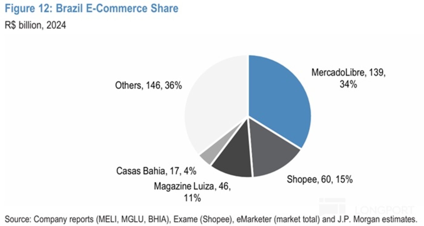 在拉美最大的市场巴西,头部电商平台有3家,分别是拉美区域龙头Meli、Sea旗下的Shopee、以及巴西本土平台Magazine Luiza。根据机构测算,在2024年这3个平台分别占据了巴西电商行业34%,15%和11%的份额。