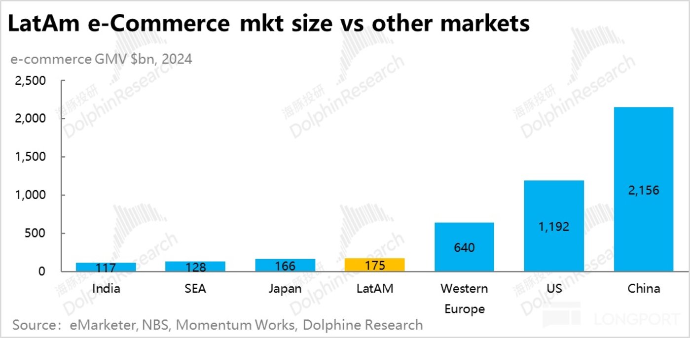据eMarketer的统计预测,拉美市场电商行业整体的市场规模在2024年约$1750亿,体量规模稍与另一主要的电商新兴市场--东南亚地区接近,GMV角度国内四大电商平台淘、多、抖、京,随便拎出来一个,年度都比它高。