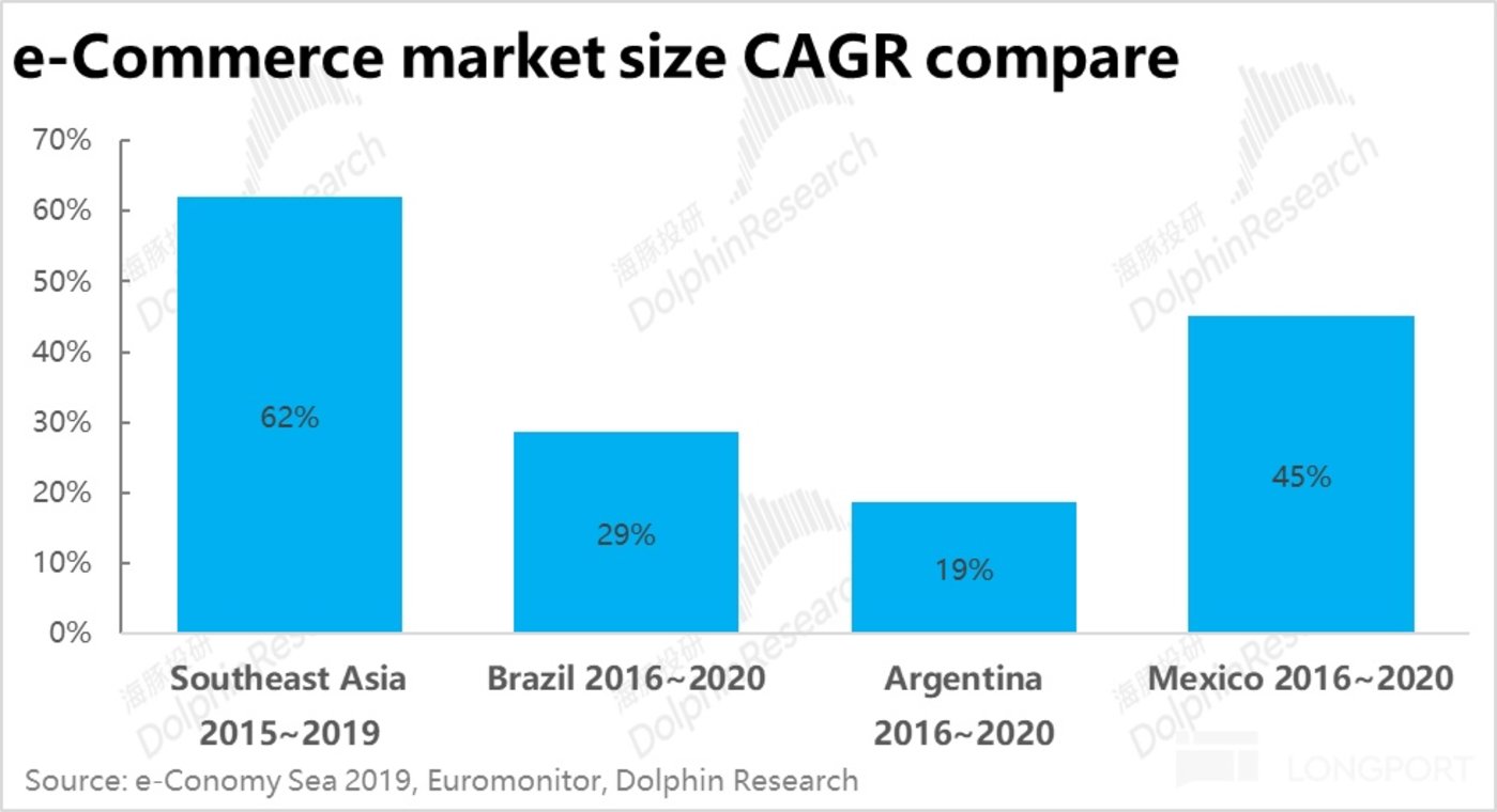 根据统计数据,东南亚地区在2015~2019年电商行业的年复合增速达到62%。而巴西、墨西哥和阿根廷这三个拉美地区最大市场2016~2020年复合增速只在19%~45%之间,这个增速对一个尚处于行业中早期的市场而言显然算不上快。