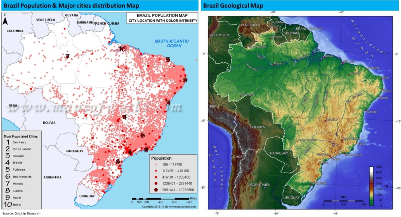 首先,巴西 “快递履约难”的最大限制是其地理和人口分布情况所决定的,不易改变。把以下巴西的人口分布和地形图结合来看,巴西的人口和主要城市都集中在沿着东部海岸线上,国土中央则分别被西北边的亚马逊和东南的大片山区所隔断。导致巴西的主要经济地区不能连接为块状,而是分布在东海岸边一条曲折且狭长的线状区域内,天然给高效的物流运输制造了困难。