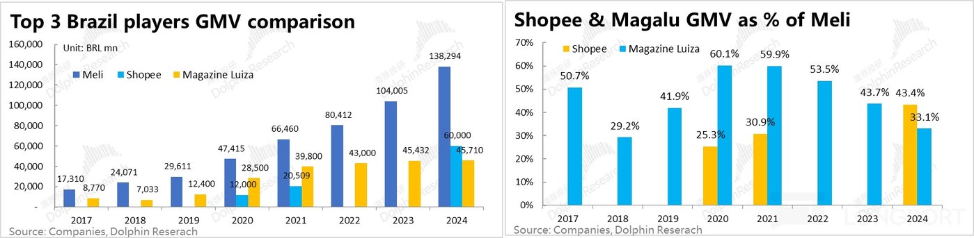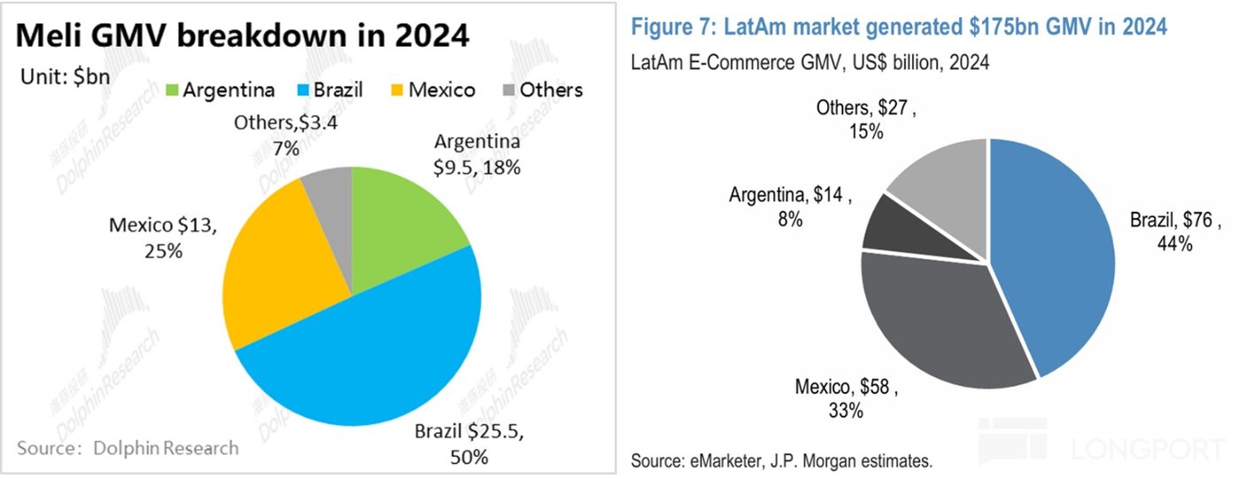 分各个国家单独市场概括来看,除了总部所在阿根廷市场Meli具备绝对的市场领先优势外,在巴西和墨西哥市场,在2024年Meli的市占率分别约为1/3和1/5,占相对多数但并非绝对多数。后文海豚将以最大的市场巴西为主进一步更详细的探讨。