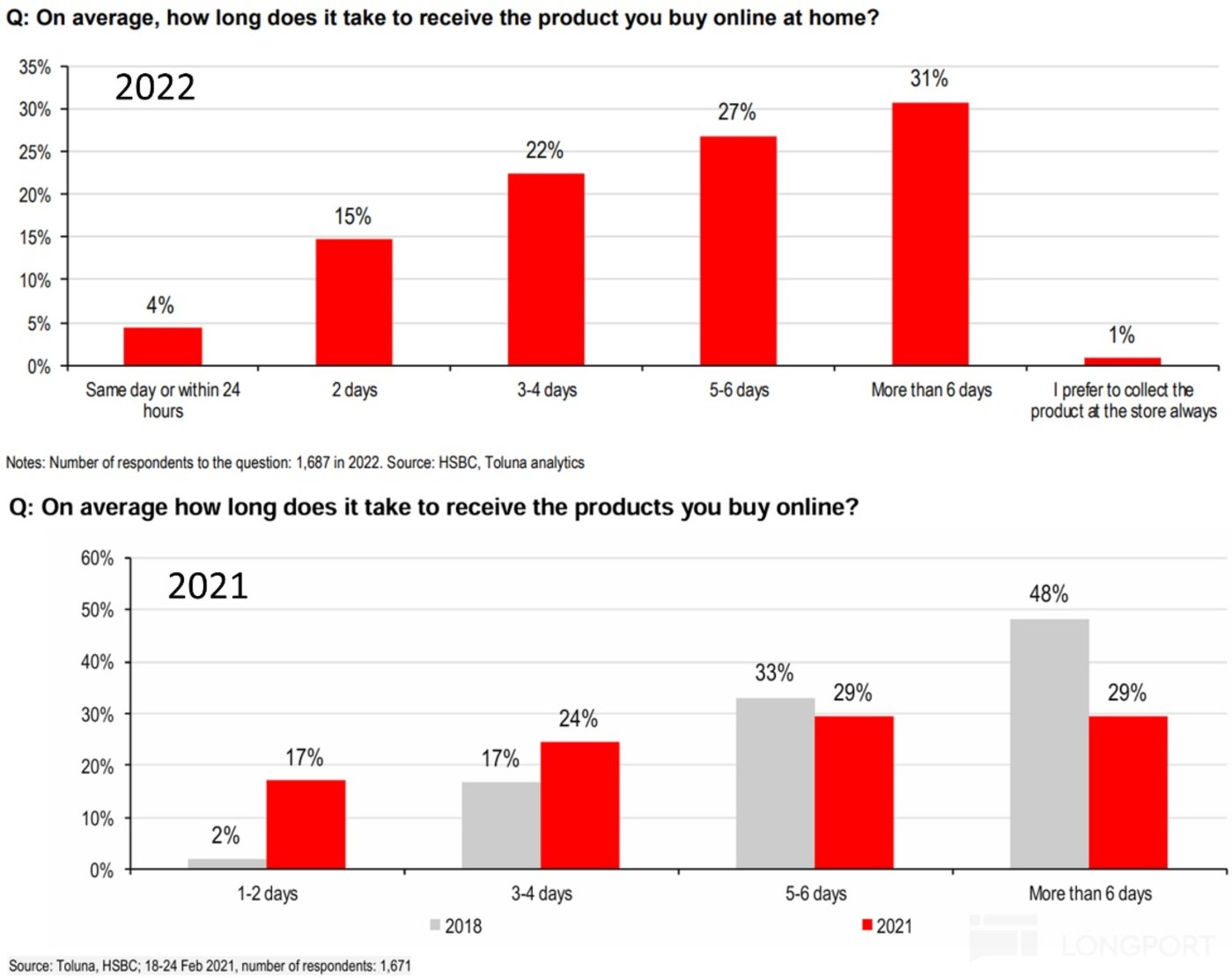 根据HSBC对巴西消费者线上购物履约所需时间的调研,中国早已做到了次日达或当日达的时候,2018年时配送需要5天及以上的比重达81%,到2022年需5天及以上的比重仍有58%。
