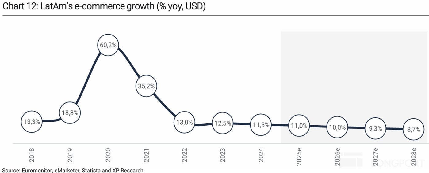 而根据另一机构的预测数据,拉美地区整体电商行业规模的增速在疫情前2年仅约13%~19%,且在疫情红利期后(2022~24年)行业增速也再度快速回落到仅10%+。