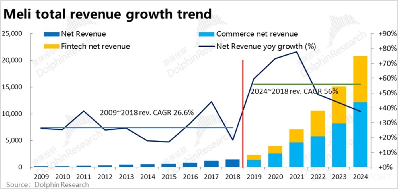 不过,Meli虽是在新千年前就已成立的“老兵”且在多年的发展中建立起了完善的业务体系,Meli直到2019年前的业绩增长却并不出彩。与Meli的股价在2019年初为节点、前后呈现明显不同的表现类似,Meli的业绩增长同样可渭泾分明的分为两个阶段。