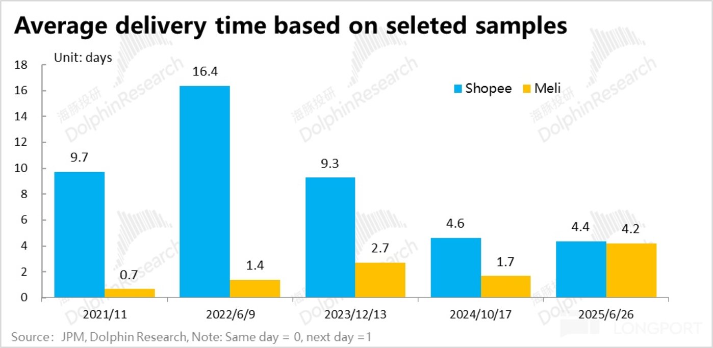 数据验证上,海豚汇总了JPM定期报告中对一些类似商品在Shopee和Meli上所需配送时间的调研。进行平均后,明确可见2021年以来Meli的配送时效一直快于Shopee,但目前的差距已比较有限。(注:由于不同年份统计时选取的商品和配送地址不完全一致,因此不同年份的数据不完全可以,主要关注同一统计时两个平台见的差距)