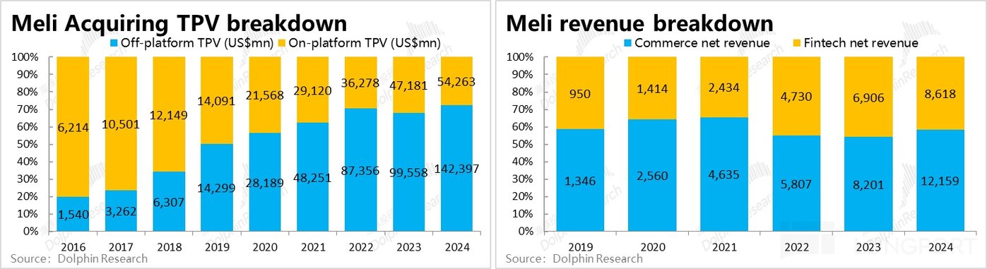 到1Q25,Meli整体约$403亿的收单支付额中,已有约65%来自于平台外。Meli的支付业务已脱离了单纯支持电商业务的辅助定位,破圈成为了用户全生活场景下的支付工具。