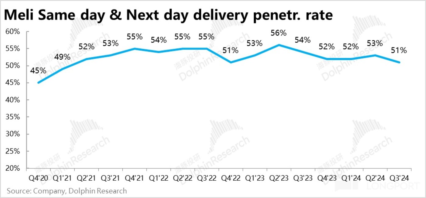 且根据JPM的测算,在2024年3季度Meli自管物流中的仓配形式的比重已达约53%(1H19时仅约7%)。换言之,拥有最优质时效和体验的仓配式已成为了Meli主流的物流履约形式。