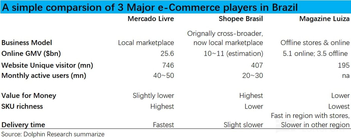 类比来看的话,海豚认为Meli、Shopee和Magazine Luiza这三家公司的模式和定位可粗略类比为中国的淘宝、拼多多和京东: