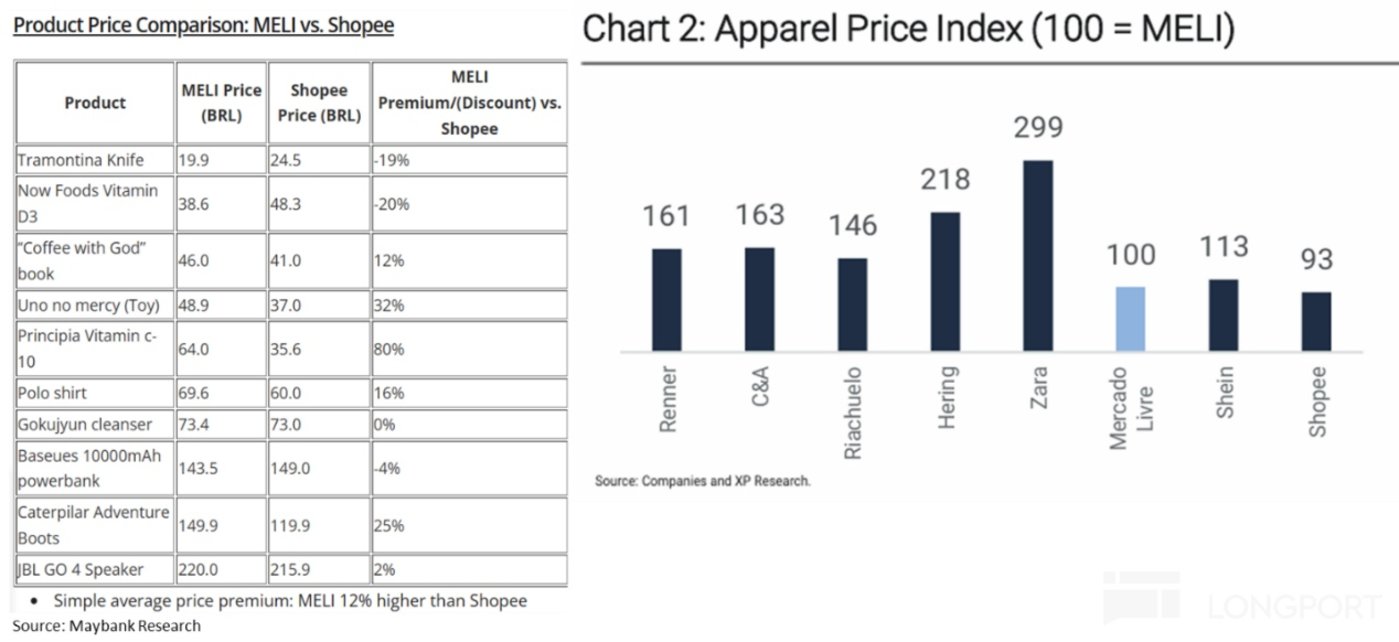 由以下两个不同机构的调研可见,第一个调研统计的10个类似商品中,Shopee平台定价比Meil低的有7个,占绝大多数。另一个主要针对服饰类商品(Shopee的优势品类)的价格调研,则显示Shopee的平均定价约比Meli低7%。