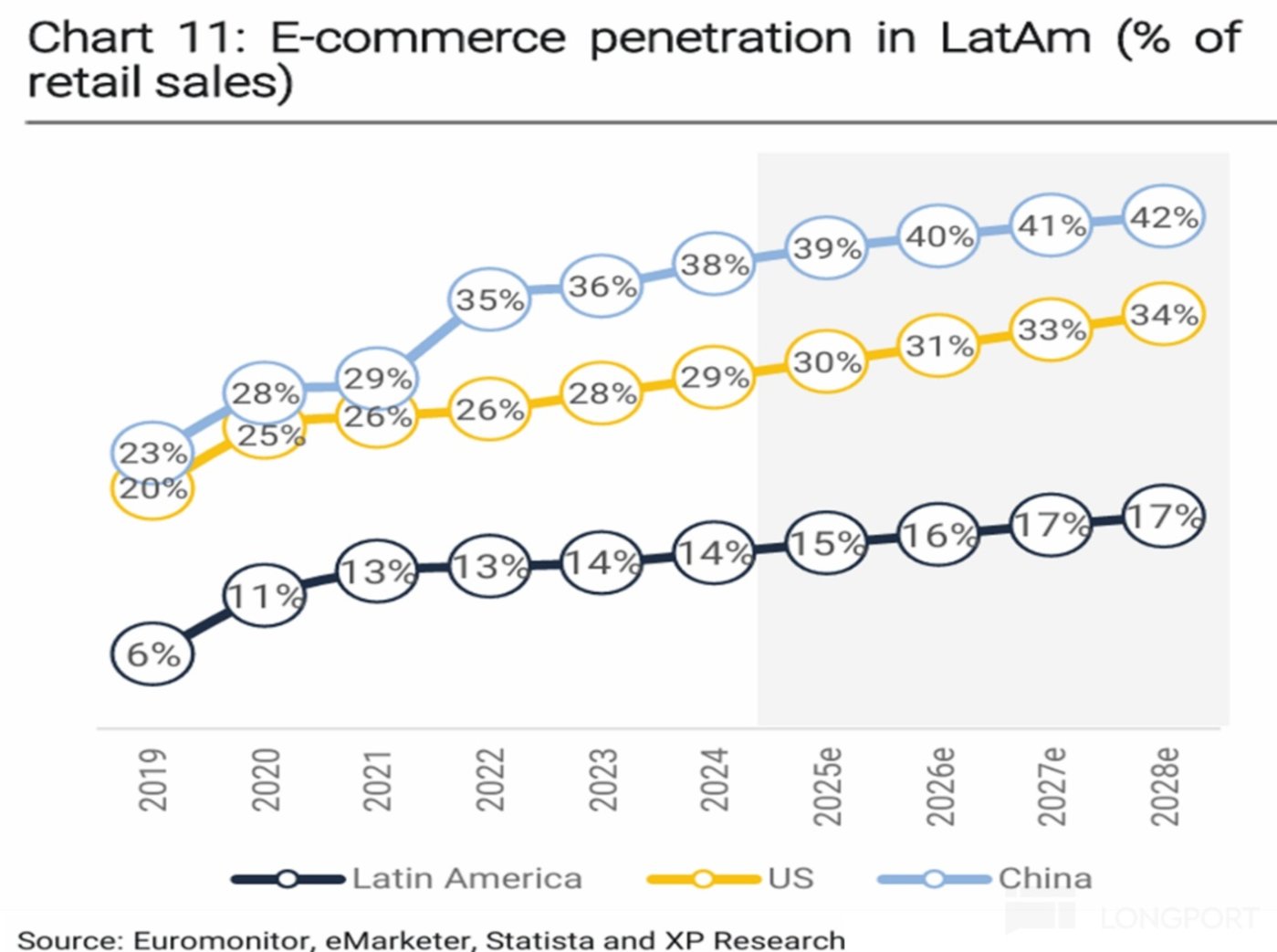 一方面,拉美地区的线上消费渗透率横向对比全球其他市场明显偏低,逻辑上有显著的提升空间;