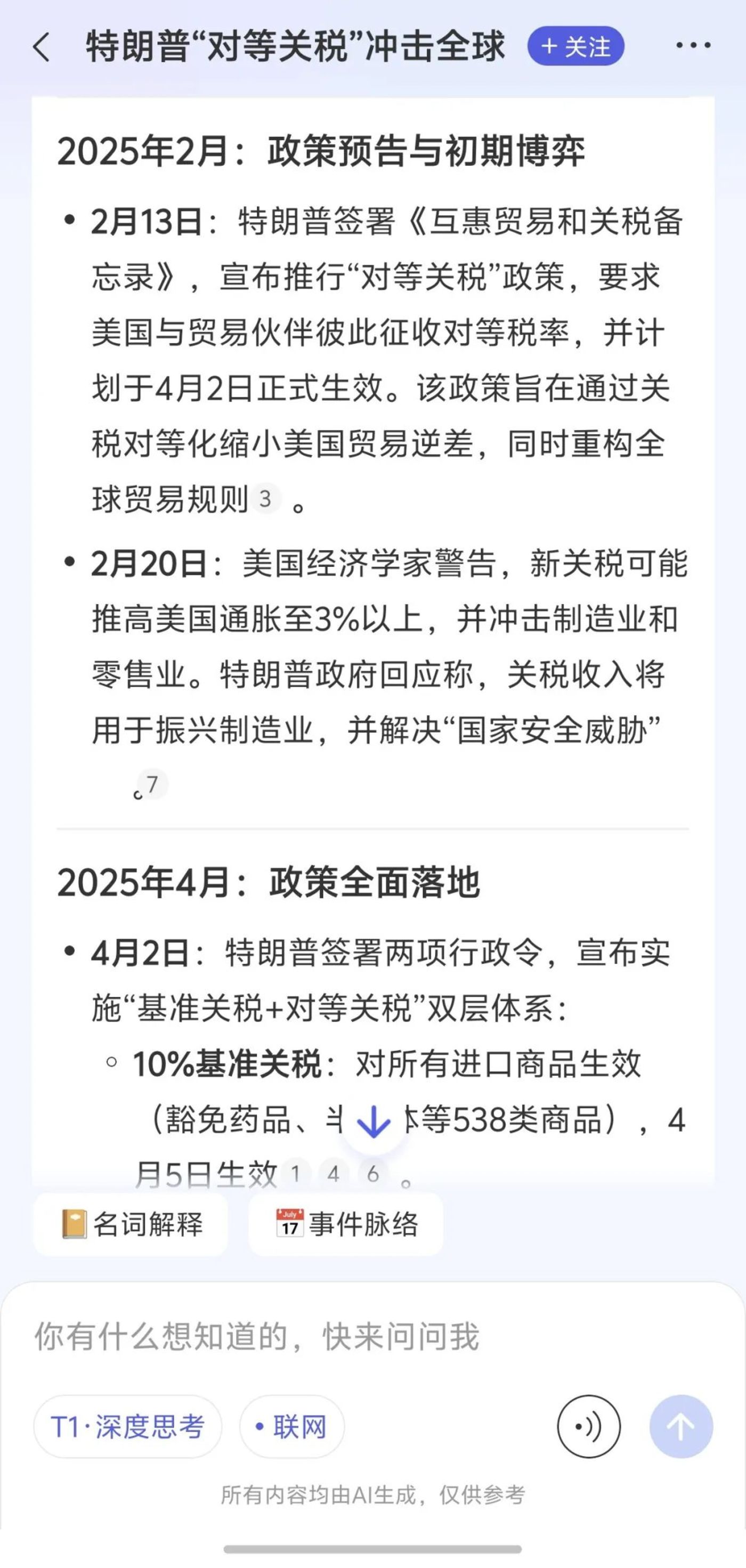 比如,笔者以中美关税为例,以此询问“新闻妹”时,它不仅能生成简要总结和相关资讯推送,还在下方放置了“事件脉络”功能,一键为用户直接讲清楚事情的来龙去脉。