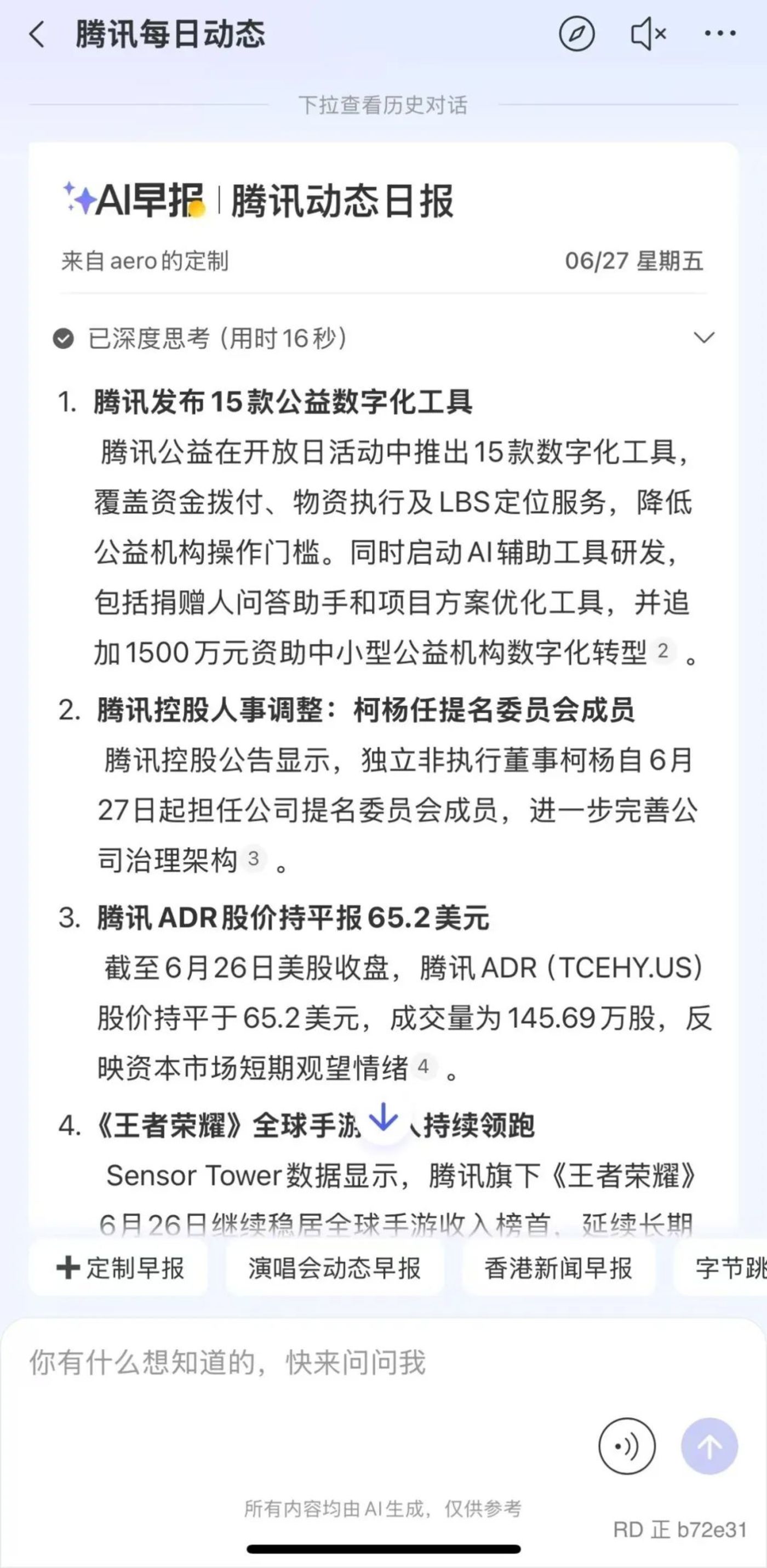 笔者看到,腾讯新闻刚推出AI早报功能。只需输入关键词和定制要求,AI会从海量资讯中精准筛选,生成高相关度的新闻简报,并每日主动推送。以“腾讯每日动态”为例,从股价变动、人事调整再到公司新产品发布,都能被AI从信息海洋中精准“打捞”上来。
