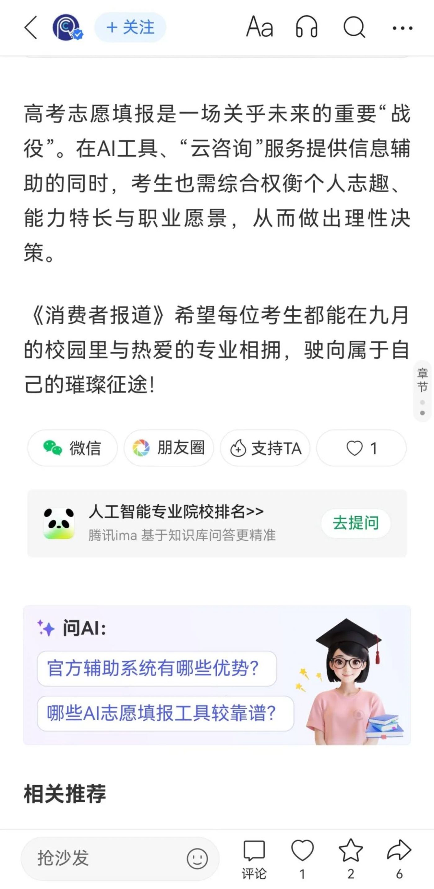 在文章、视频形态之外,智能体成了三款App均植入的一个醒目功能。打开App的主界面,新浪新闻的“智慧小浪”和今日头条的“头条AI”都统一挂在了右上角。腾讯新闻则把智能体“新闻妹”的入口放到了个人界面中,以及在文章阅读中,如果使用过“新闻妹”,右下角就会出现“新闻妹”悬浮图标以供随时唤起。甚至在评论区,笔者也看到了“新闻妹“的评论互动。