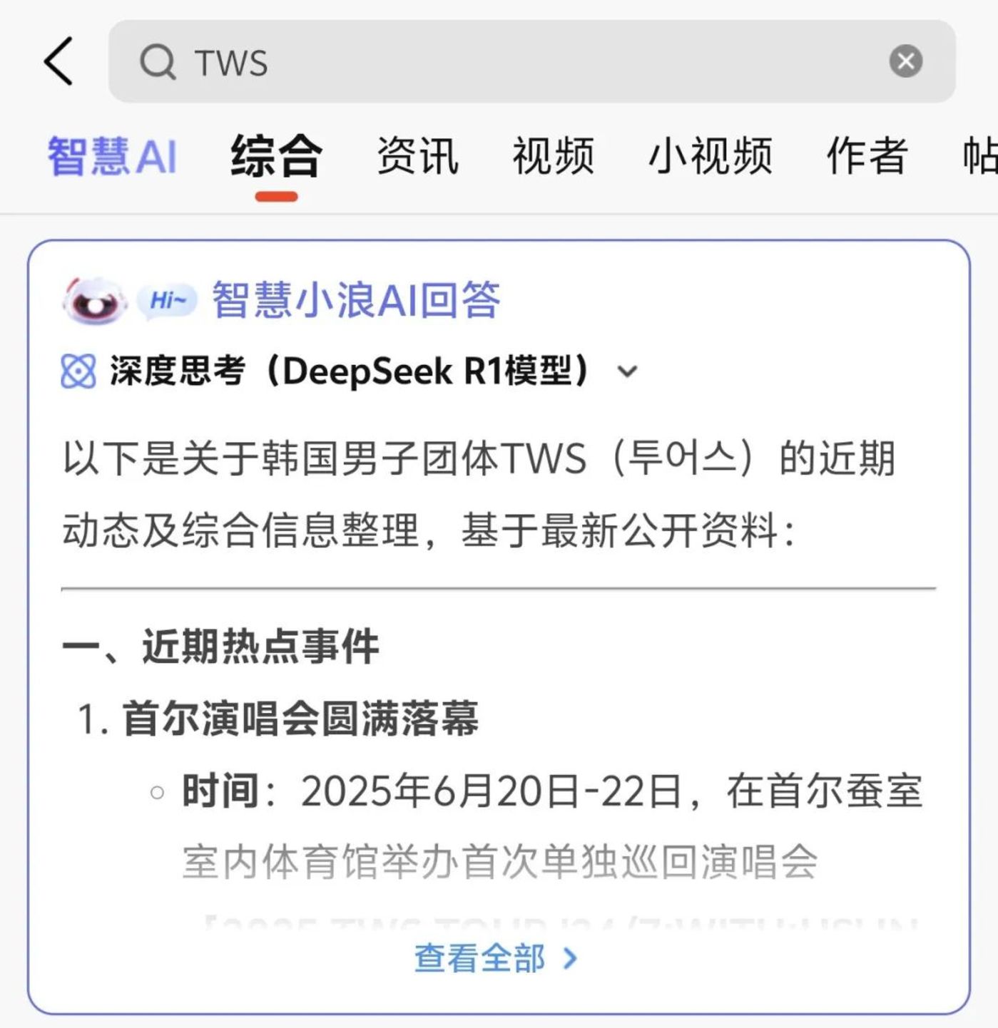 从搜索准确度来看,“新闻妹”的搜索基于文章内容引申,在给出答案后,还能给出延伸问题,供用户继续提问。而新浪的搜索只是基于词语的综合搜索,遇到多义词识别的情况下,容易给出不符合文章内容的答案。比如,在搜索介绍蓝牙耳机文章中的“TWS”时,“智慧小浪”给出了韩国同名男团的解释。