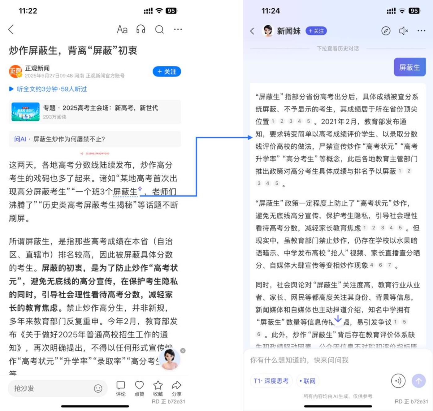 当下,多数新闻App的AI都是直接调用大模型提供服务,但缺少关于新闻的Know-how和对应报道领域的内容积累。在深度思考模式加持下,幻觉问题进一步影响着AI生成、总结内容的准确度。