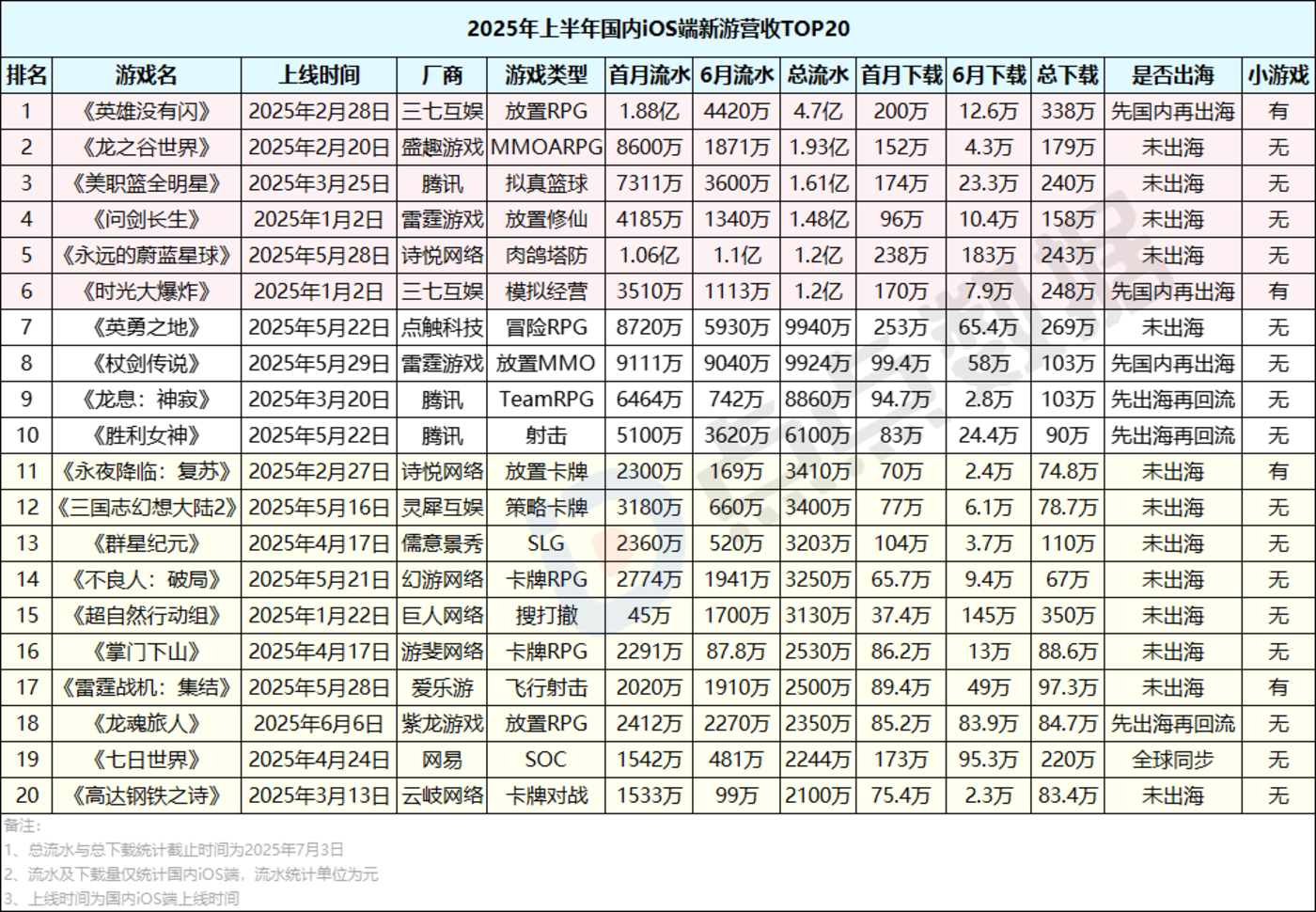 国内游戏产业在基本面上可谓一片向好,那么在纯粹的新游层面上是否也是如此呢?为了更加直观的了解今年上半年国内新游的实际情况,点点出海整理了2025年1月-6月上线新游国内iOS端流水TOP20的榜单排名。