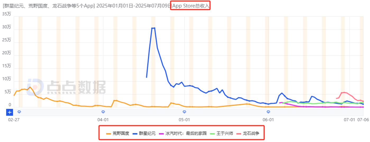 《群星纪元》是本次唯一入榜的SLG游戏,其首月iOS端流水虽然有2360万元,但数据下滑极快,目前仅为520万。